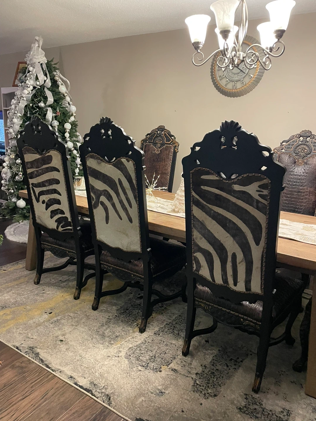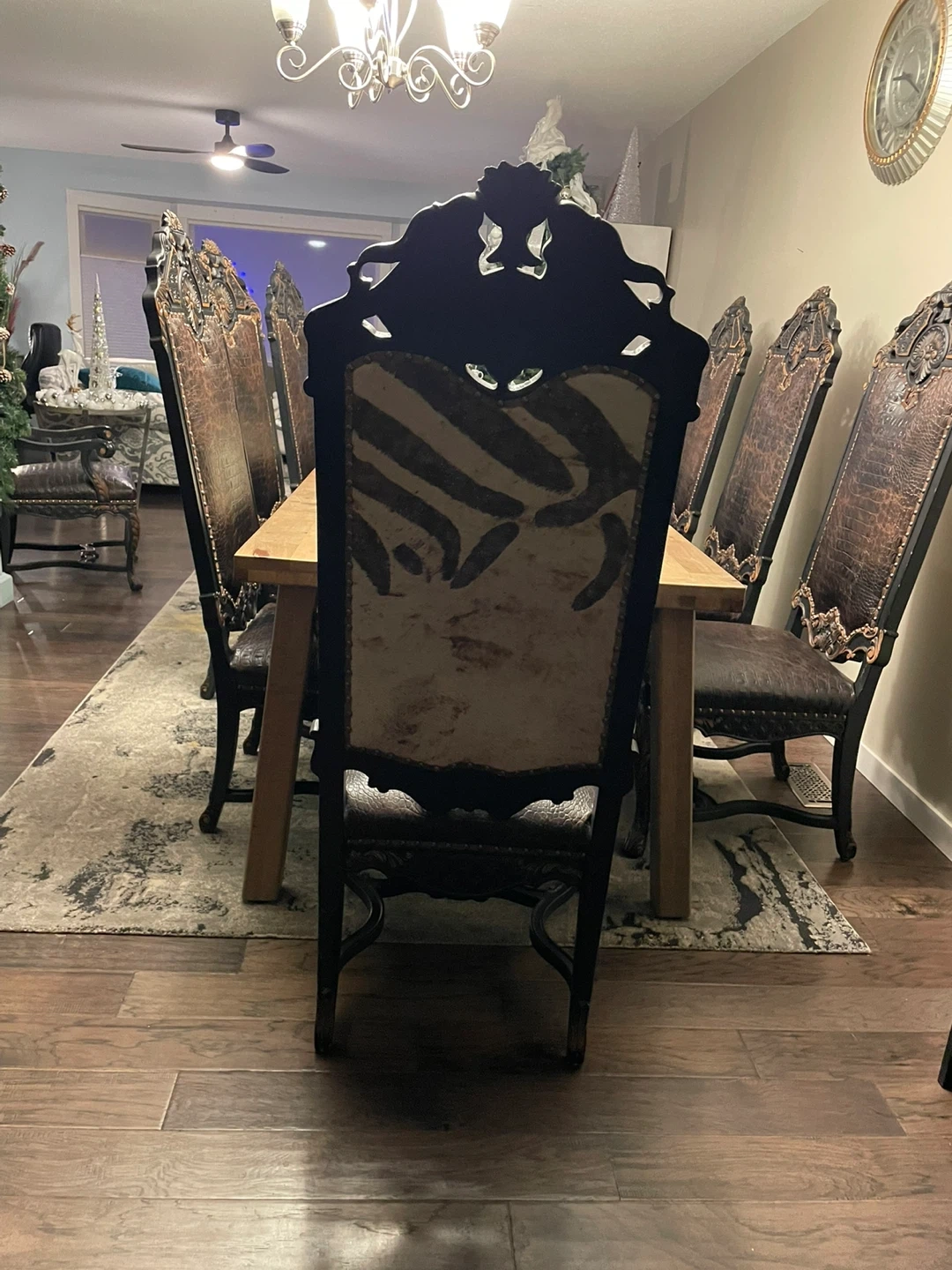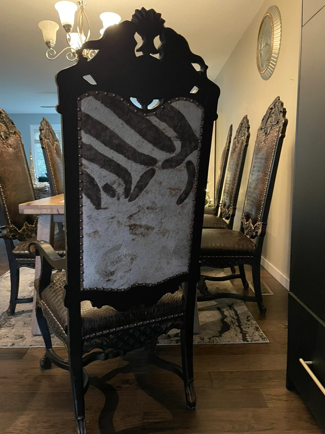 Eight ornate dining chairs featuring dark wood frames with carved accents. All chairs have zebra upholstery on the back, and textured brown crocodile leather on the seats and backs. They're studded for a decorative finish. Perfect for adding a statement to your dining room! Rent out for movie sets and earn! This is “Game of Thrones” worthy!