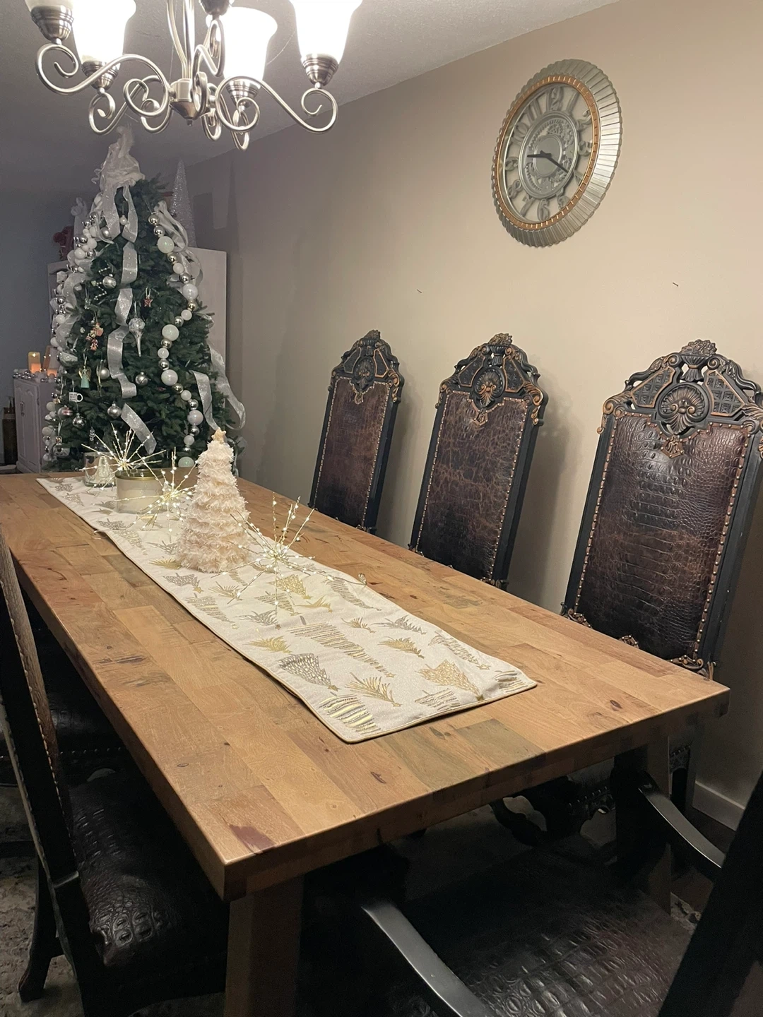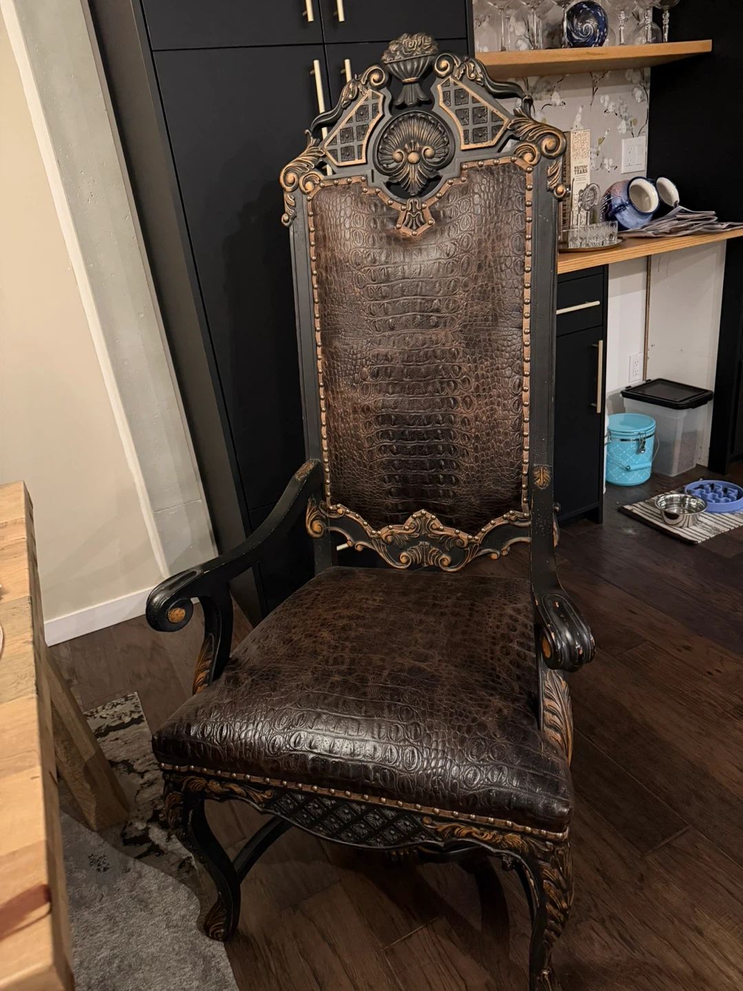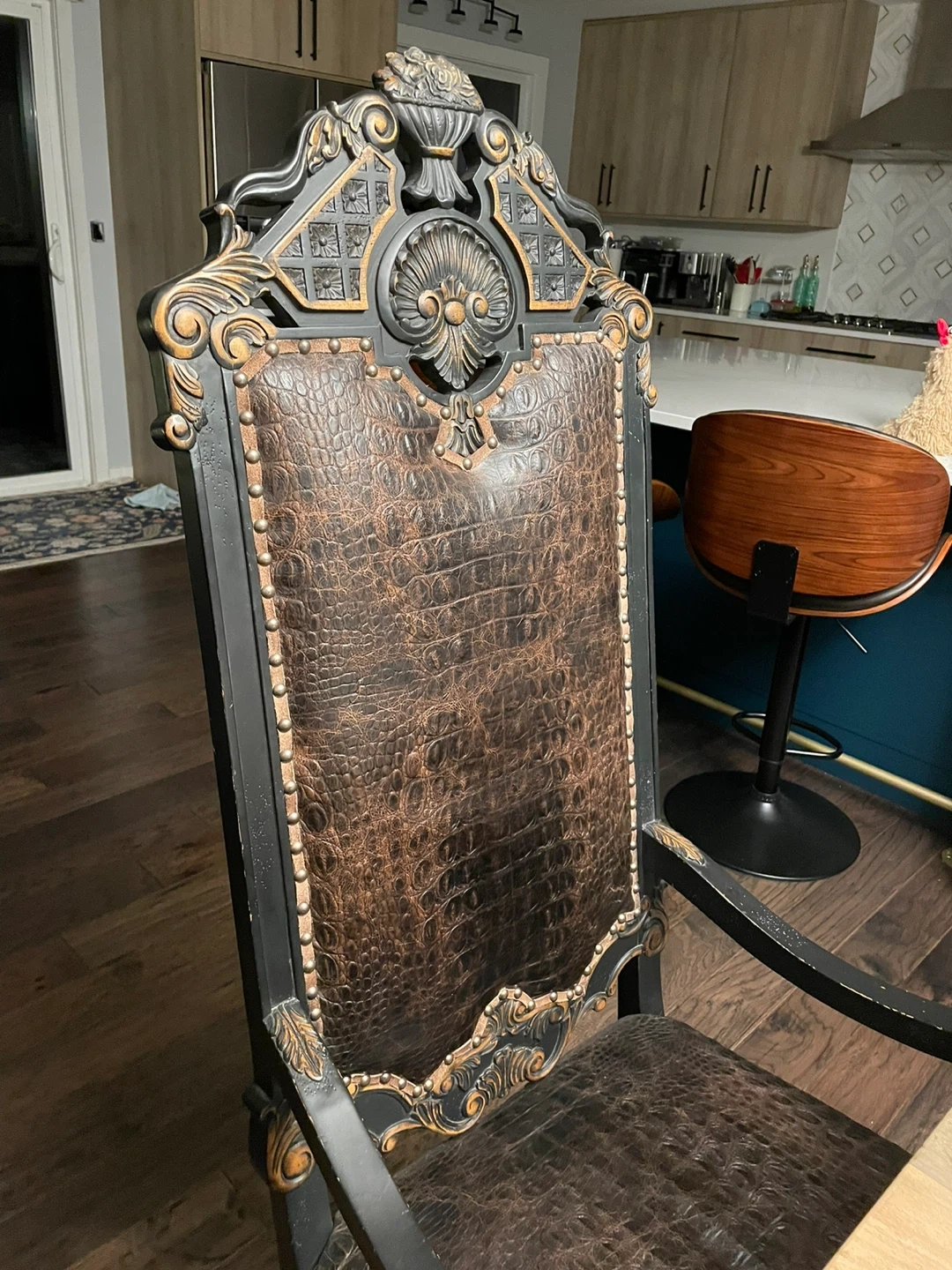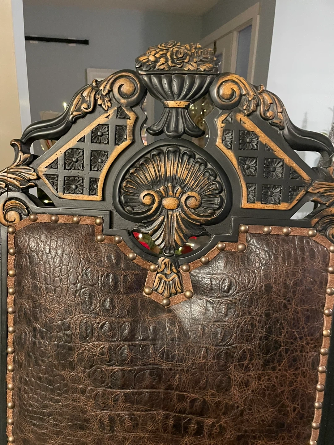 Eight ornate dining chairs featuring dark wood frames with carved accents. All chairs have zebra upholstery on the back, and textured brown crocodile leather on the seats and backs. They're studded for a decorative finish. Perfect for adding a statement to your dining room! Rent out for movie sets and earn! This is “Game of Thrones” worthy!