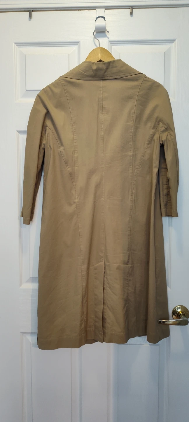 A stylish khaki trench coat, perfect for layering. It features a tie belt and classic collar. This coat offers a mid-length cut and a lightweight feel.