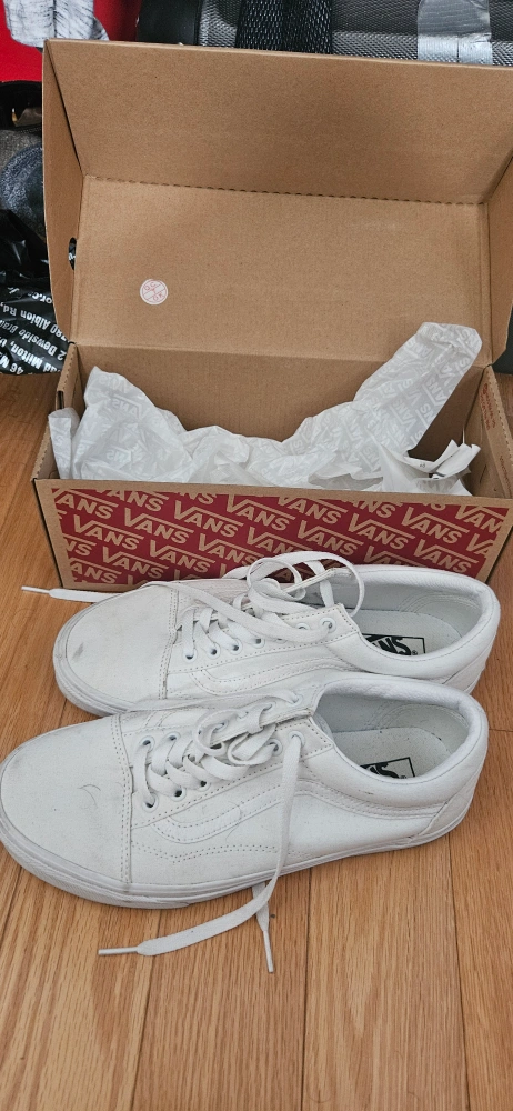 Pair of white leather Vans Old Skool sneakers. Comes in original box. Classic style.