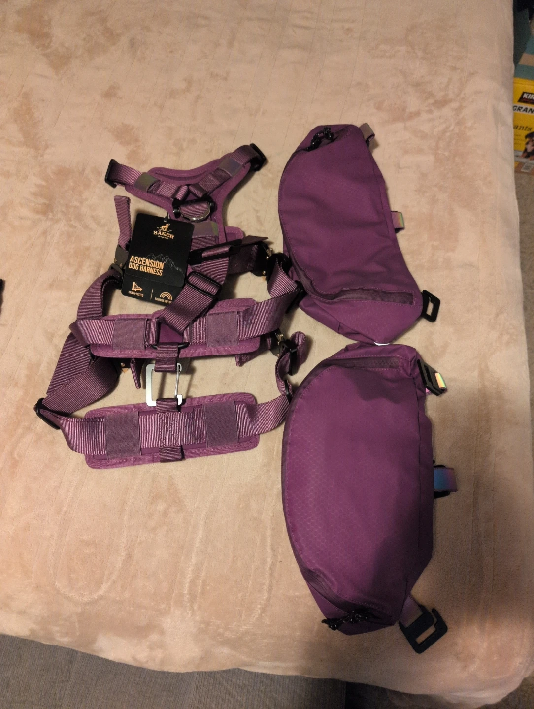 This Säker Ascension dog harness is designed for your dog's safety. It's crash-tested and features rainbow reflective elements for visibility. The harness comes with two detachable pouches for carrying essentials. Made from durable materials for outdoor adventures.