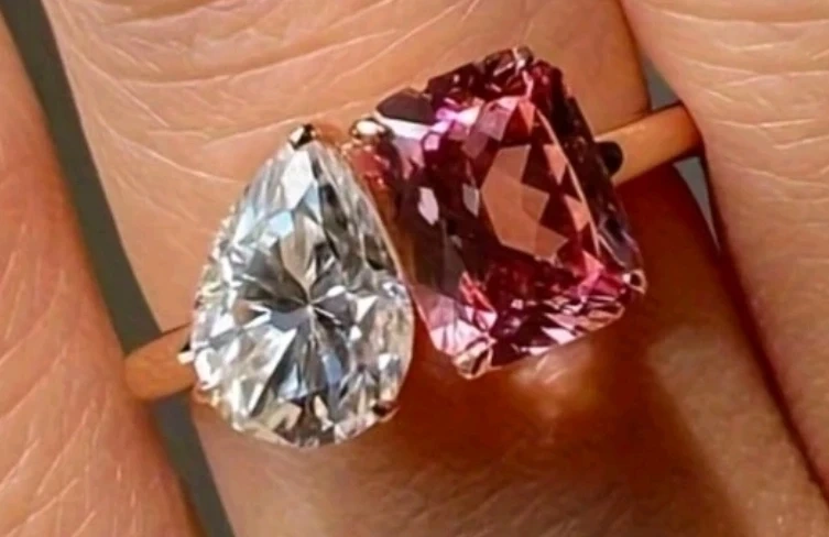 Stunning ring featuring a pear-cut clear gemstone paired with an emerald-cut pink gemstone. It's a beautiful statement piece for any occasion!
