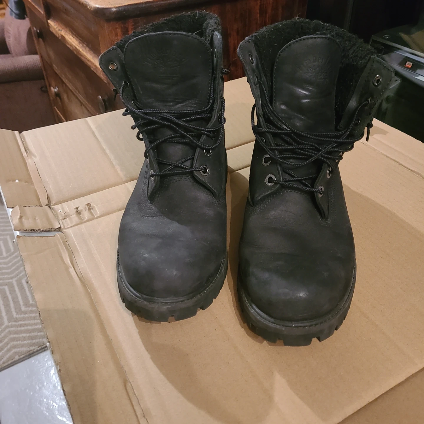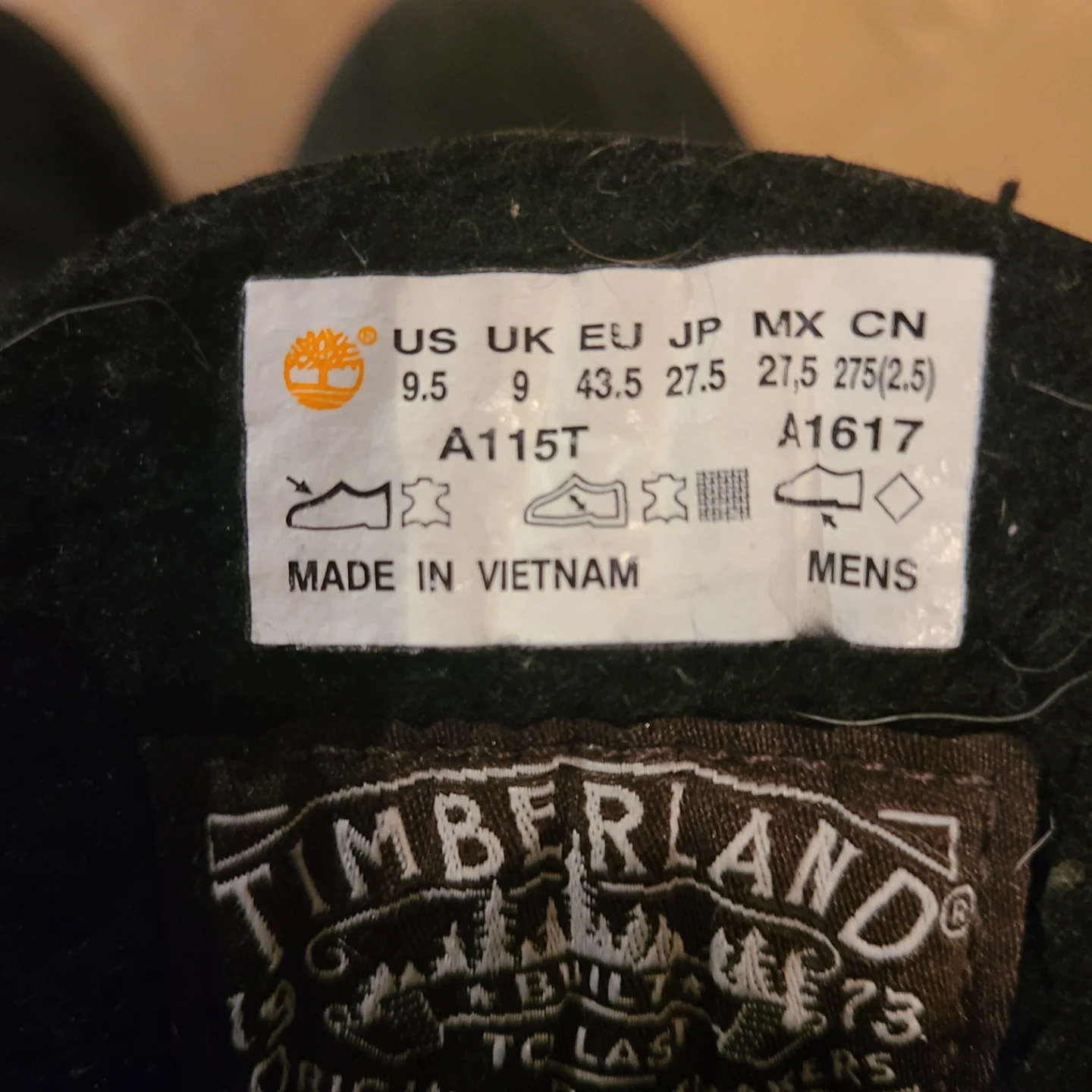 These are black Timberland lace-up boots. Made in Vietnam. They're men's size 9.5 US. Featuring a durable sole and warm lining.