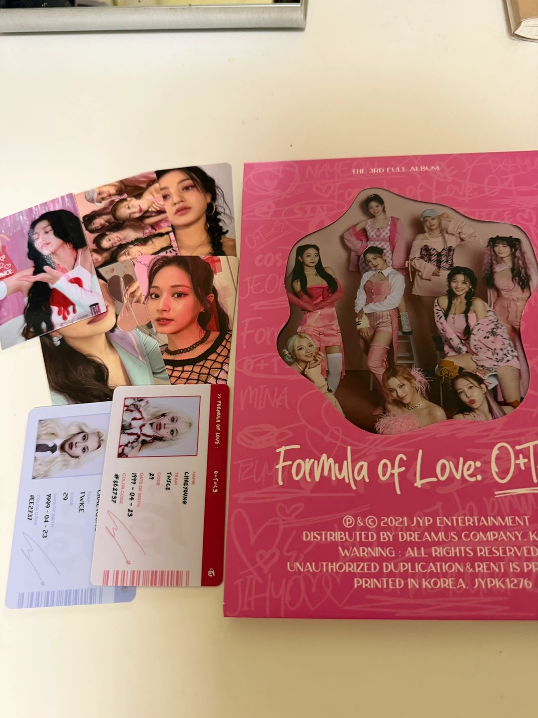 Selling the Twice Formula of Love album. Includes photocards, other inclusions, and pre order benefit photocards set shown in the photos.