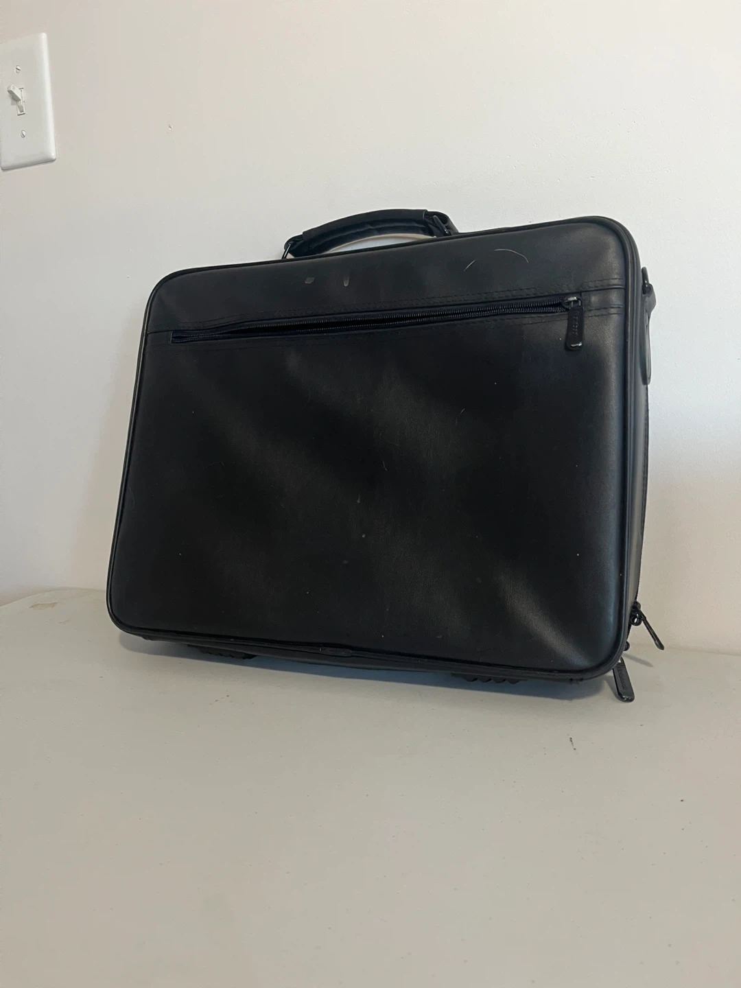 This is a black leather briefcase. It has a zippered main compartment and a front pocket with a snap closure. The material is durable faux leather. It's suitable for carrying documents and a laptop.