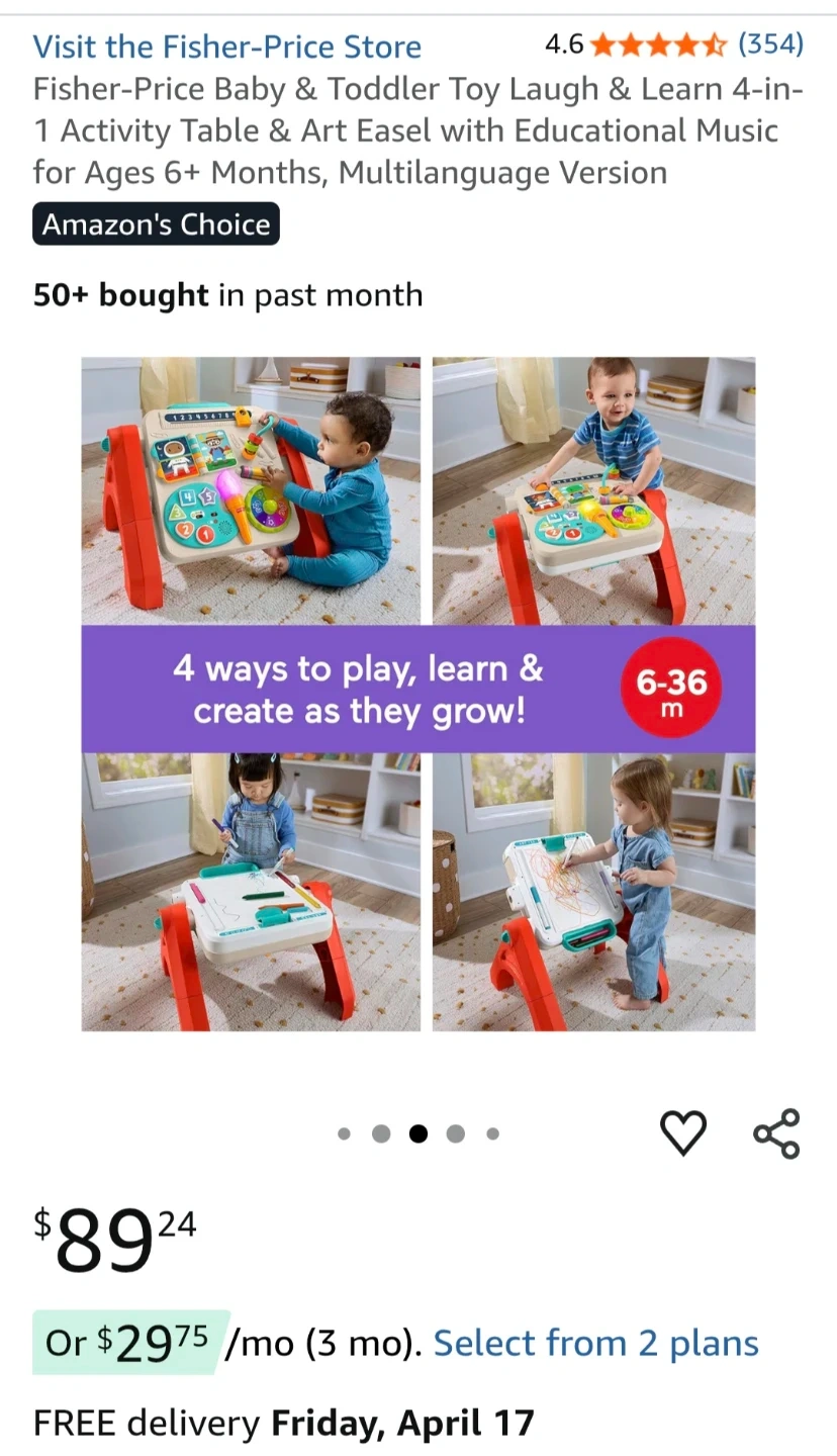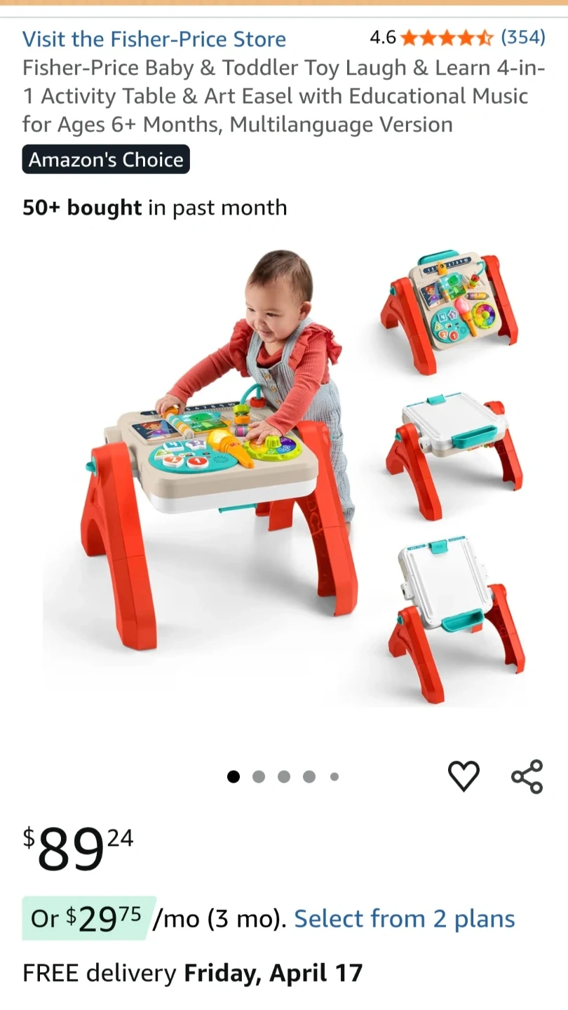 Fisher-Price Laugh & Learn 4-in-1 activity table and art easel. It's designed for ages 6+ months and includes educational music. This toy offers multiple ways to play, learn, and create as children grow.