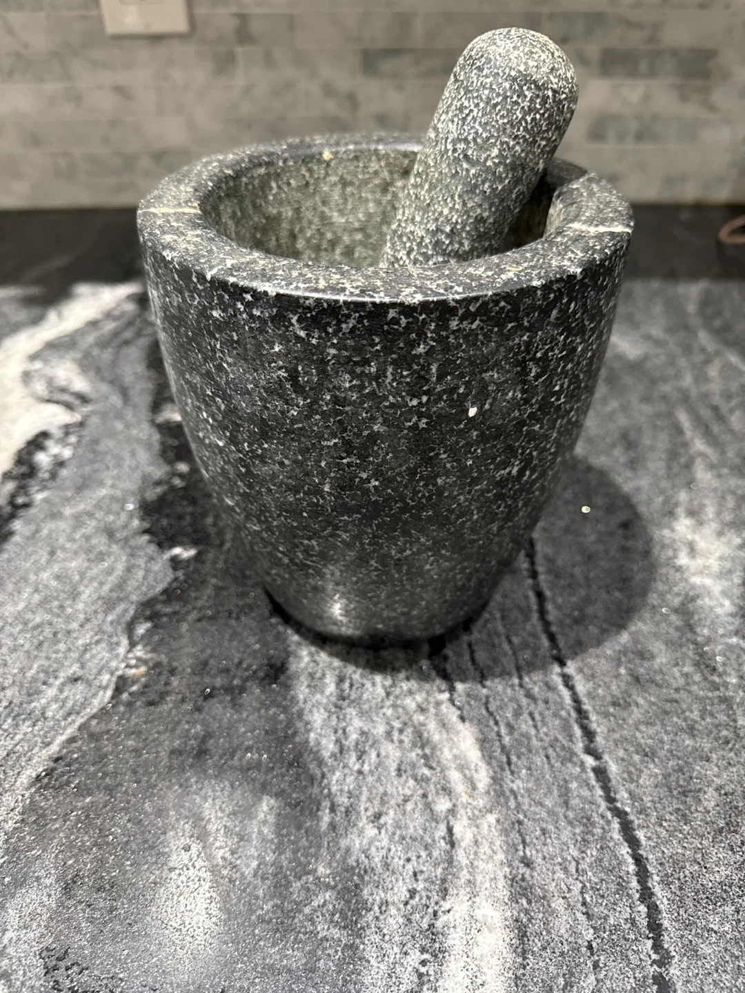 This mortar and pestle set is made from durable granite. It's perfect for grinding spices and herbs. The set includes one mortar and one pestle.