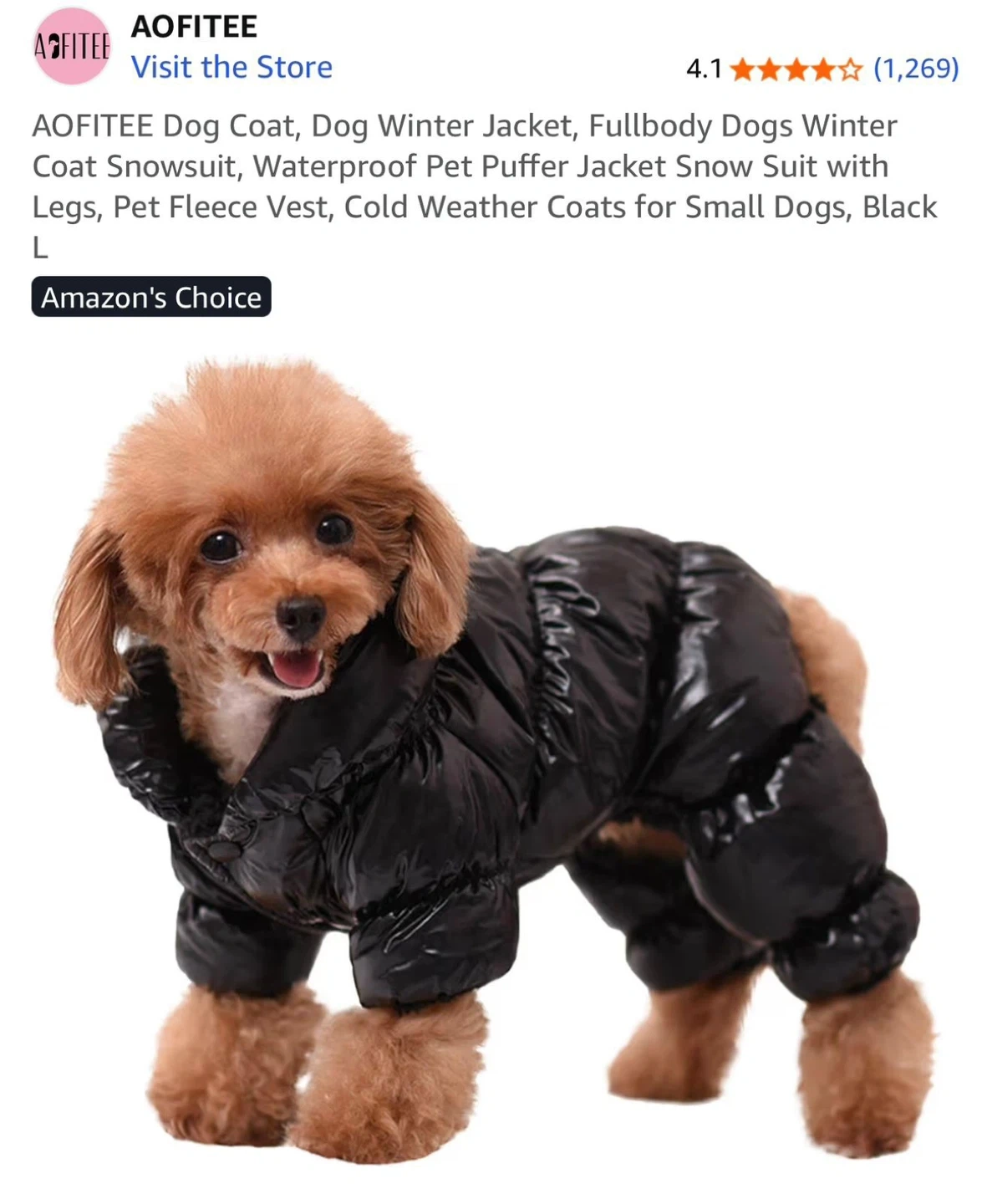 AOFITEE dog winter coat for fullbody dogs. It's waterproof and a pet puffer jacket snow suit with legs. Chest size 40 cm, neck size 41 cm. Minimum weight recommendation is 7 pounds.