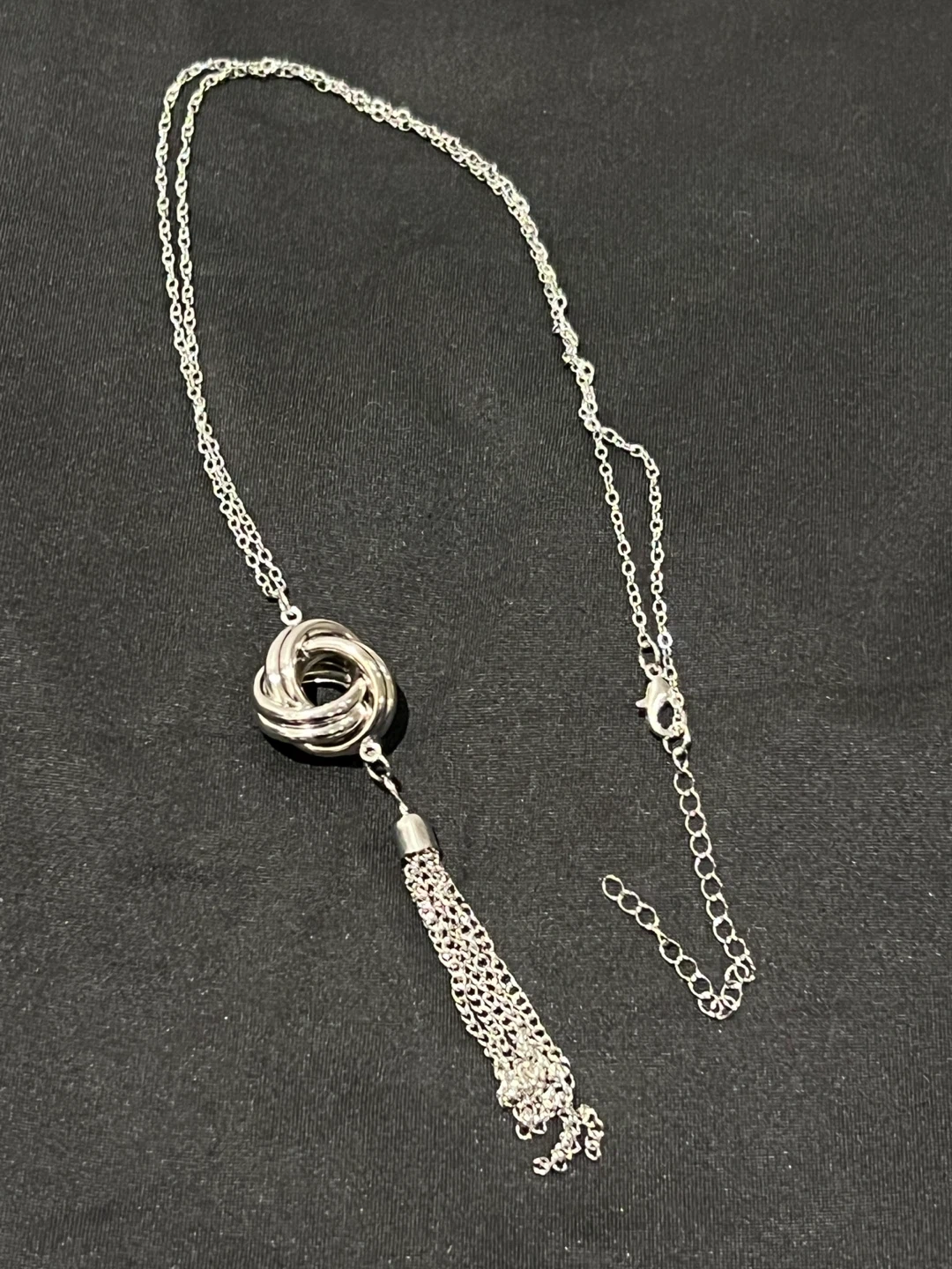 Silver tone necklace featuring a knot pendant with a delicate chain tassel. The chain has an extender for adjustable length. It's a stylish accessory for any occasion.