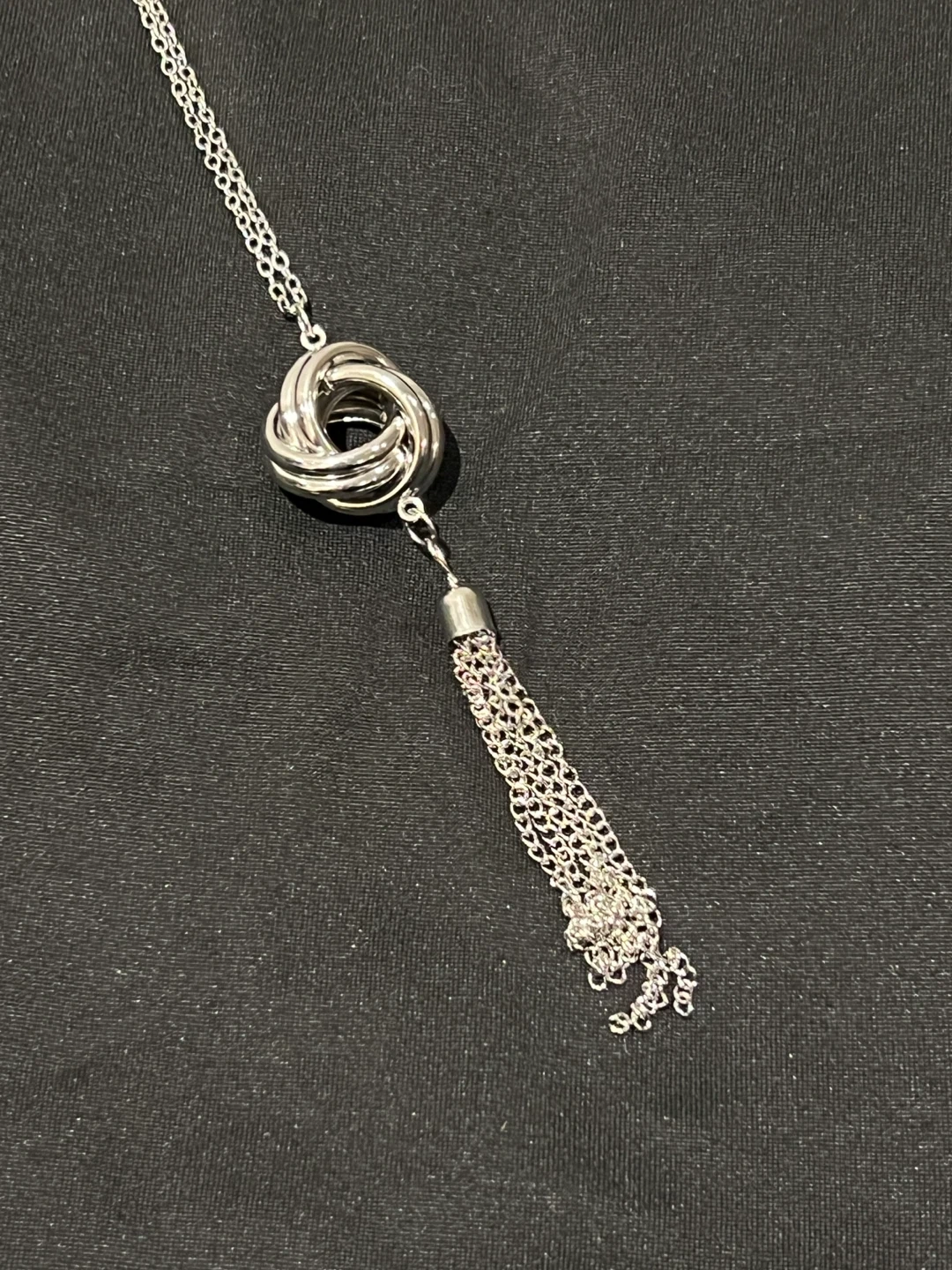 Silver Tone long Necklace with Knot and Tassel Pendant