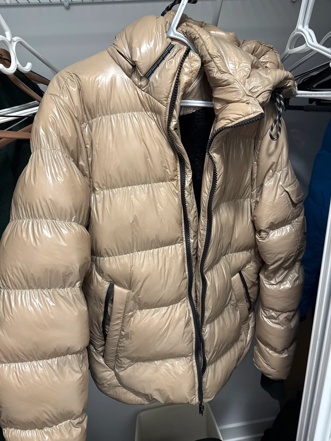 Here's a beige puffer Men jacket! It's in great condition and ready for the colder weather. The jacket features a full zipper and a hood.