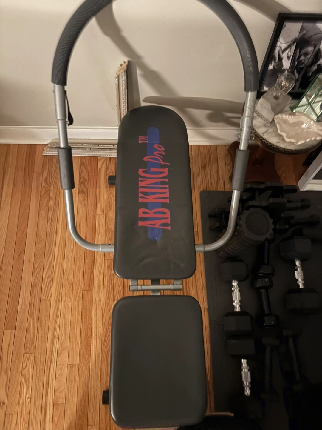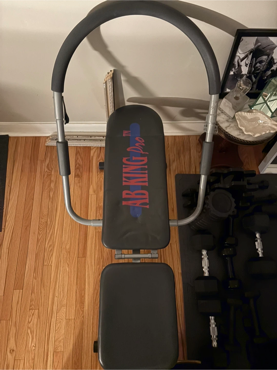 This is an AB King Pro exercise machine. It's designed for core workouts and has padded grips. The adjustable seat provides comfort during use.