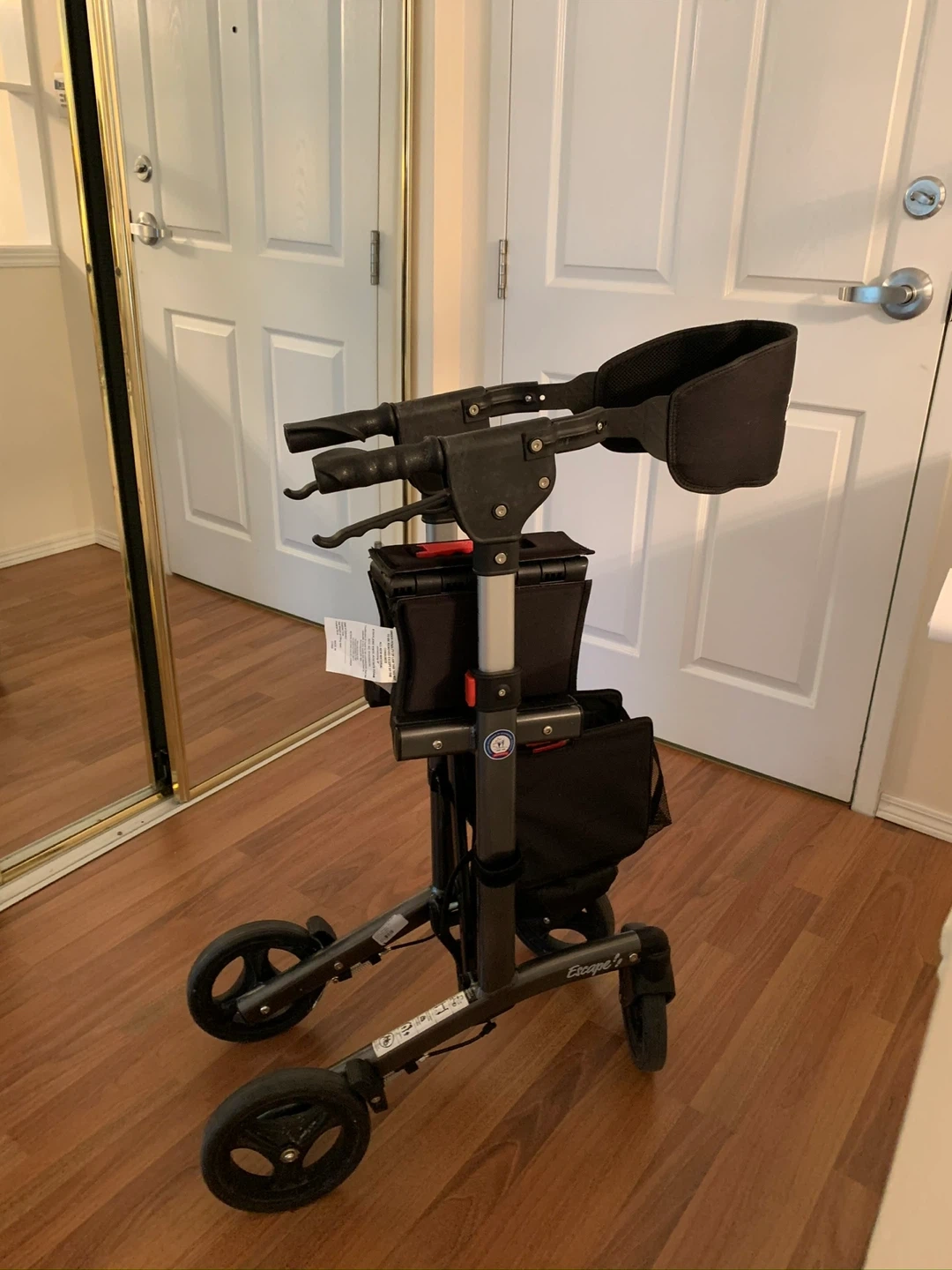 This is an Escape brand rollator walker. It's black and grey with adjustable handles. It features a seat and a storage bag underneath. It's lightweight and folds for easier transport.