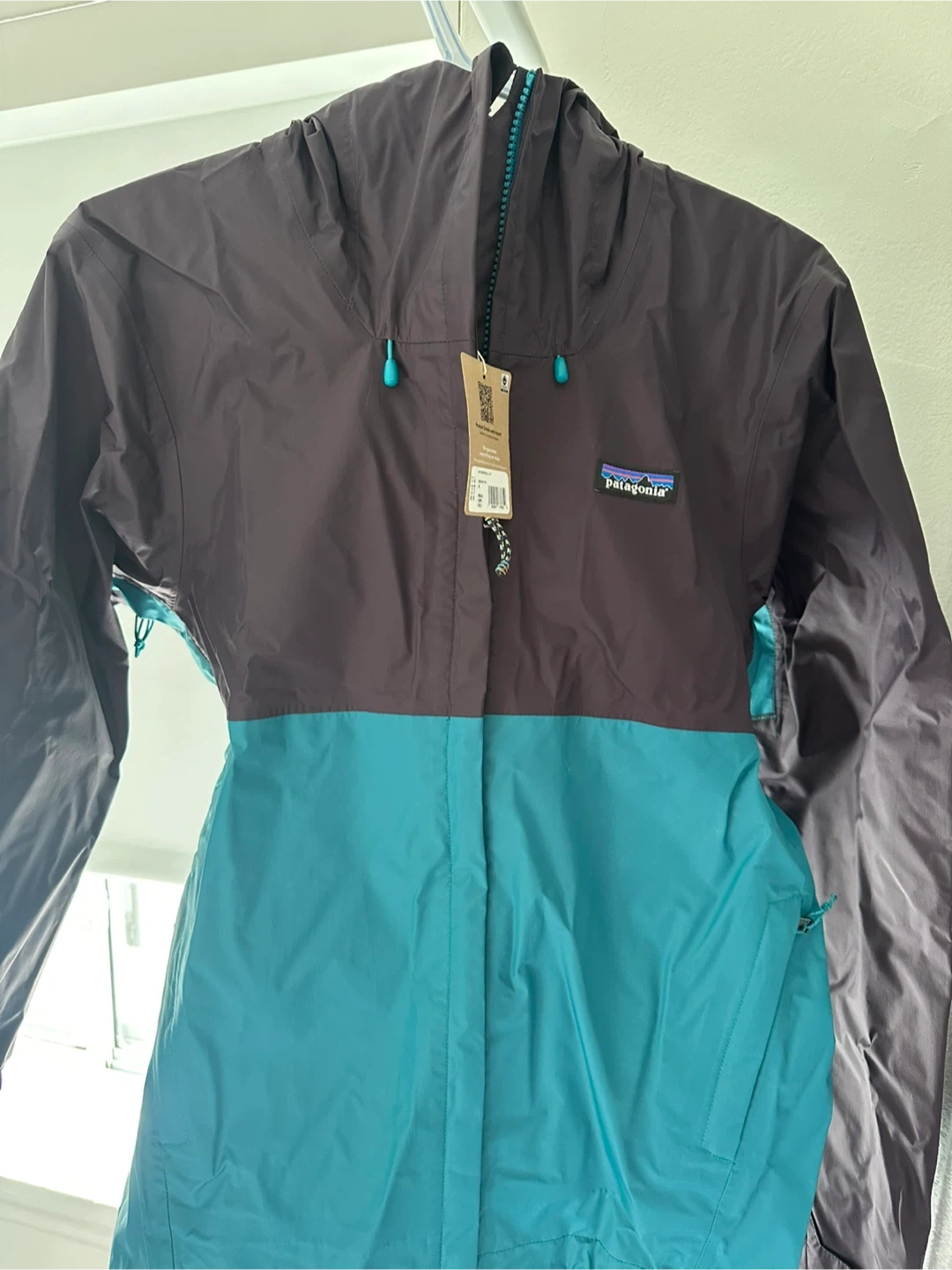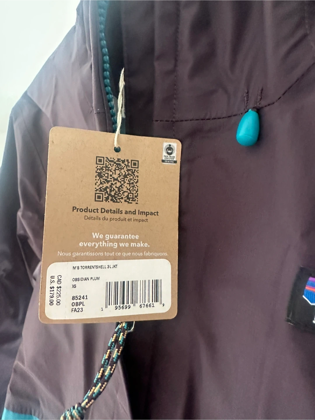 Patagonia Torrentshell 3L jacket in Obsidian Plum. It's size XS. It's a great jacket for outdoor activities. It's made with waterproof and breathable materials.
