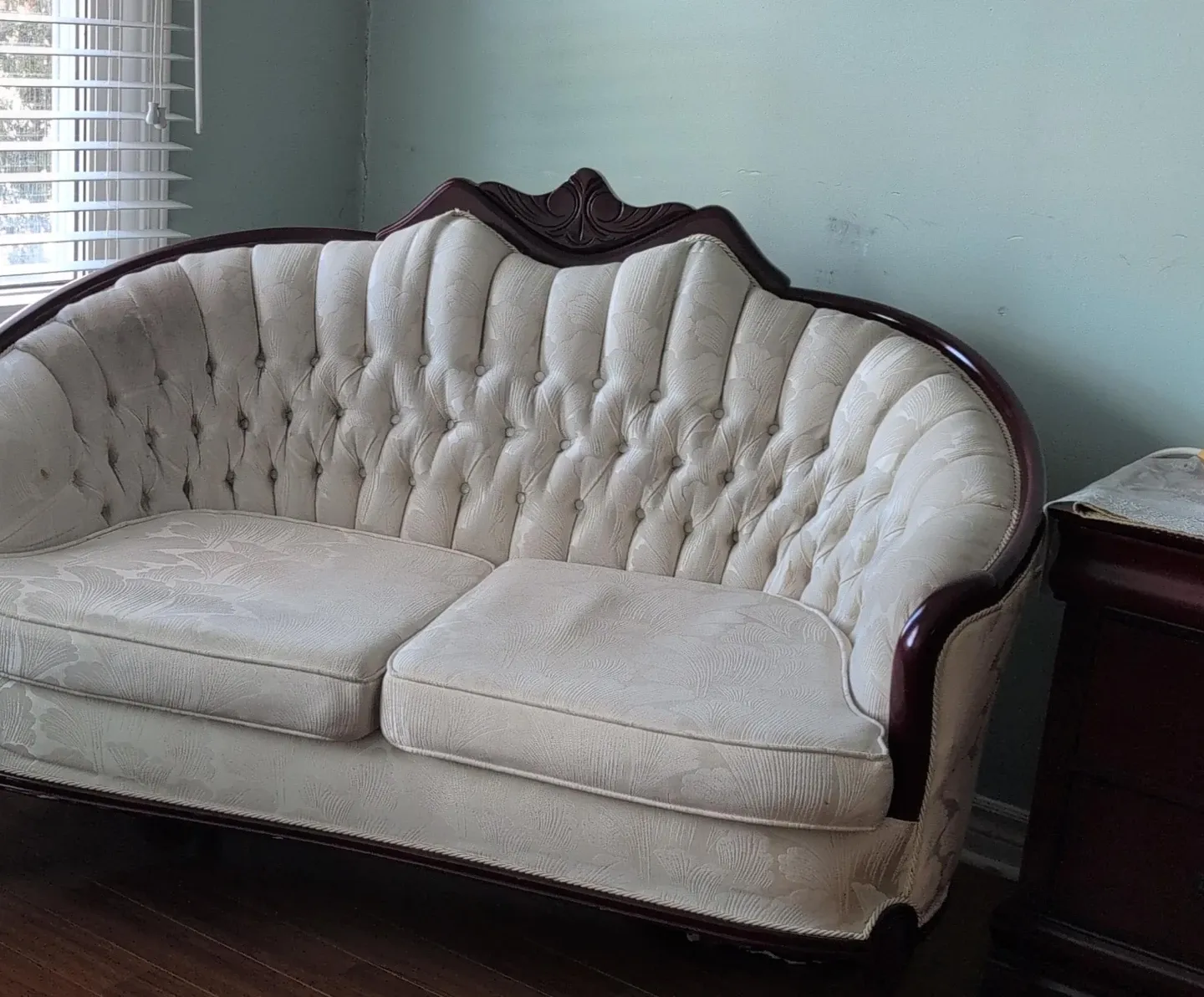 A classic tufted cream sofa with a patterned fabric. It features a dark wood frame and trim. Upholstery looks like a jacquard weave. The sofa has two seat cushions.