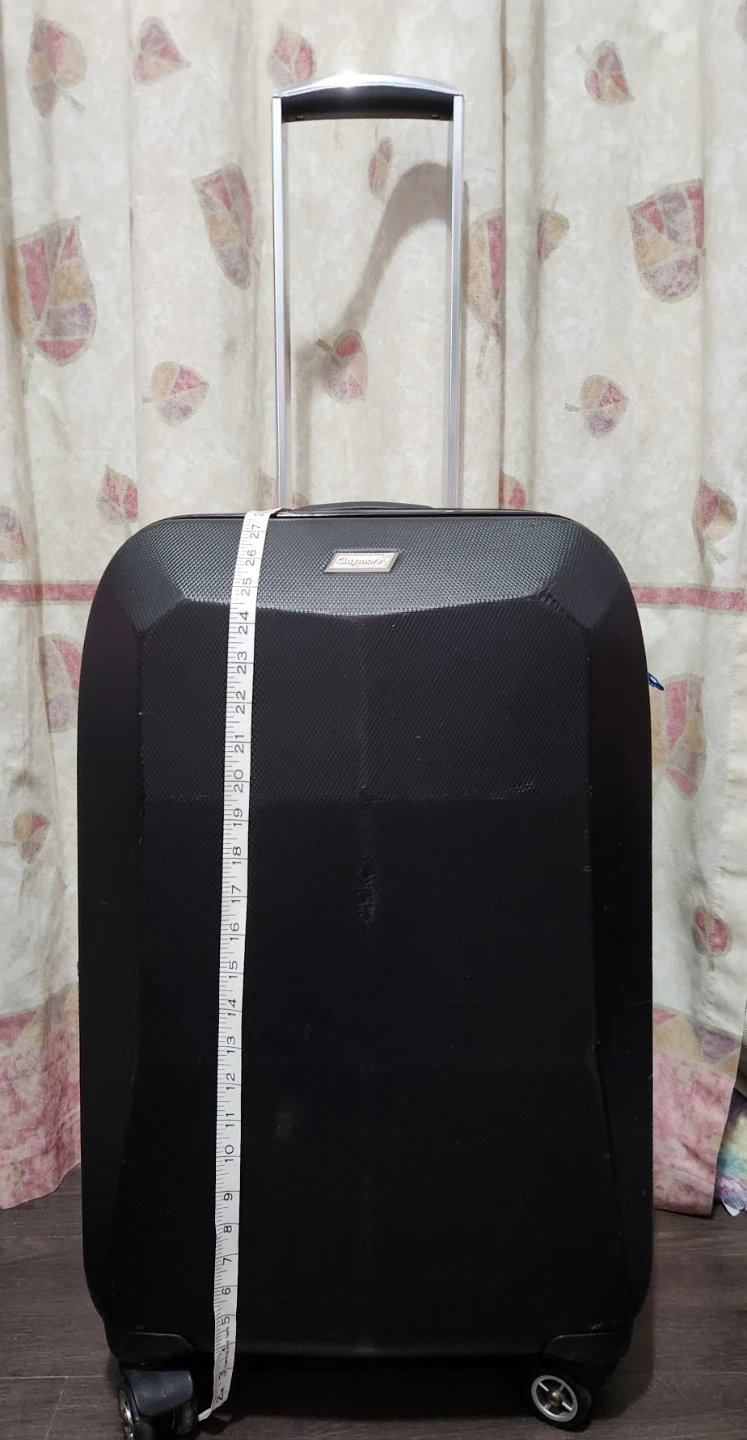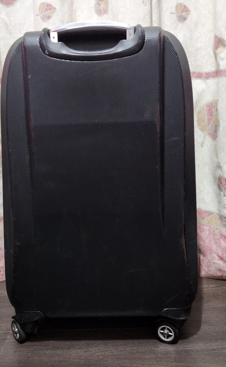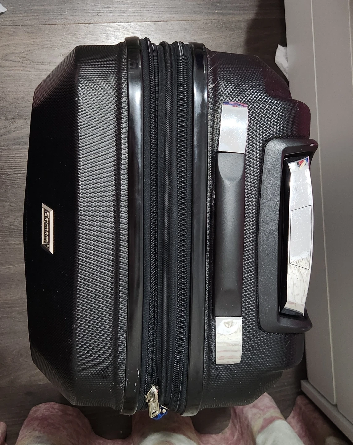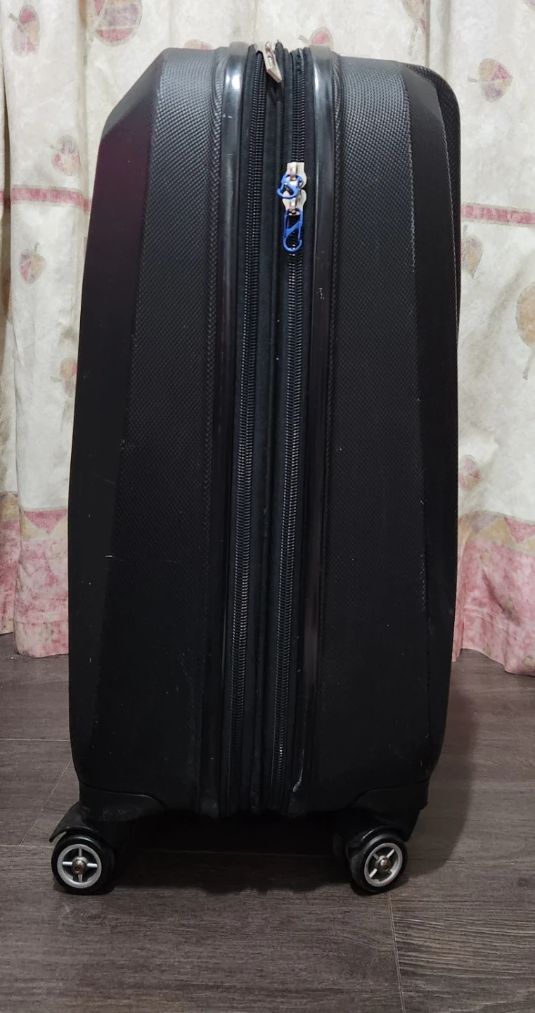 This is a black hard-shell spinner suitcase. It features a textured exterior and a zip-around closure. The suitcase has a telescopic handle and four spinner wheels for easy manoeuvrability. The main compartment expands for extra packing space. It is 27 cm tall. Great for weekend getaways or longer trips! The zippers are missing but replaced with blue pins that work the same way.
