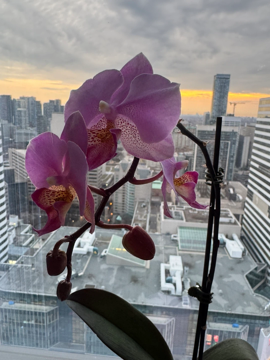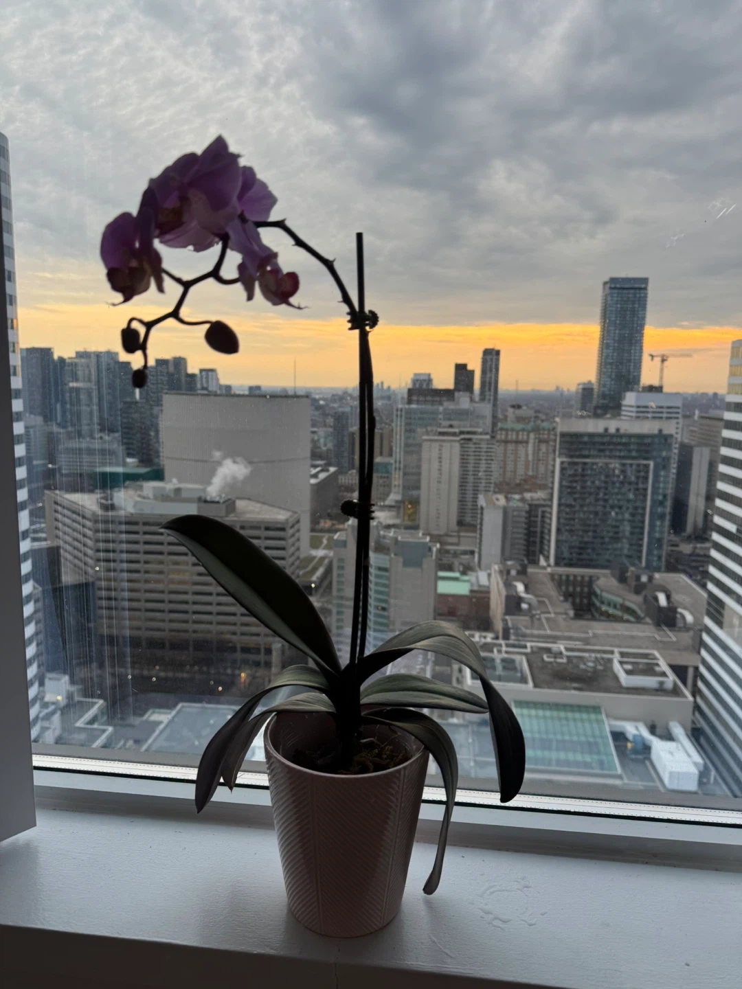 A lovely purple orchid plant with several blooms. It's potted in a simple pink container. This plant brings a touch of natural beauty indoors!