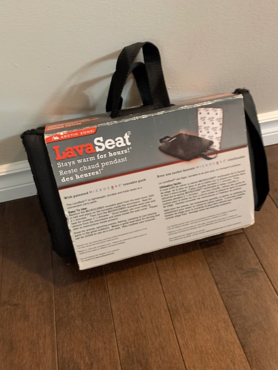 This Lava Seat features a patented MICROCEL reusable pack that heats in the microwave. It's lightweight, durable, and comes in a carry pack. Stays warm for hours!