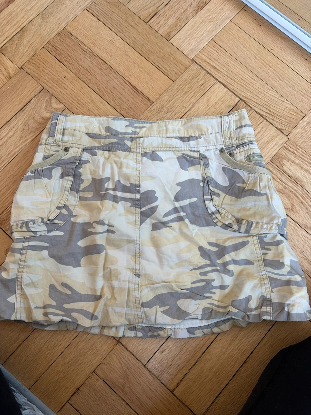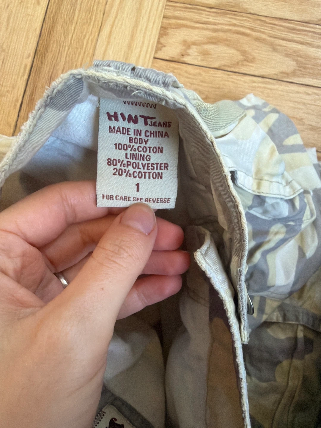 Hint Jeans cargo skirt with a camouflage print. Body is 100% cotton with an 80% polyester and 20% cotton lining. It has multiple pockets and a zip fly.