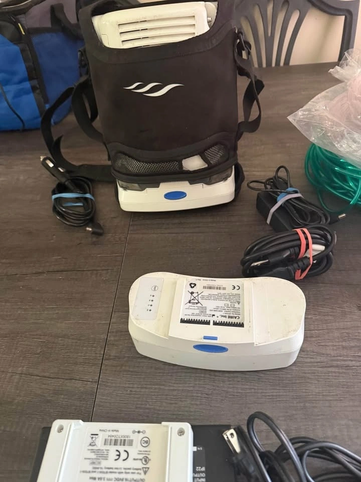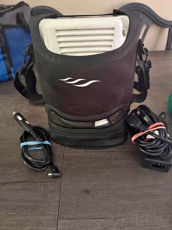 This is a compact and lightweight portable oxygen concentrator with a curved design for comfort. The device uses pulse dose technology to deliver oxygen when the user inhales, conserving battery life. Comes with an extra battery, an additional battery charger, and all charging cables, including a car adapter. Original new cost for the concentrator with one battery was $2700, the battery charger was $325, and the spare large battery was $589. Asking $2000 for everything.