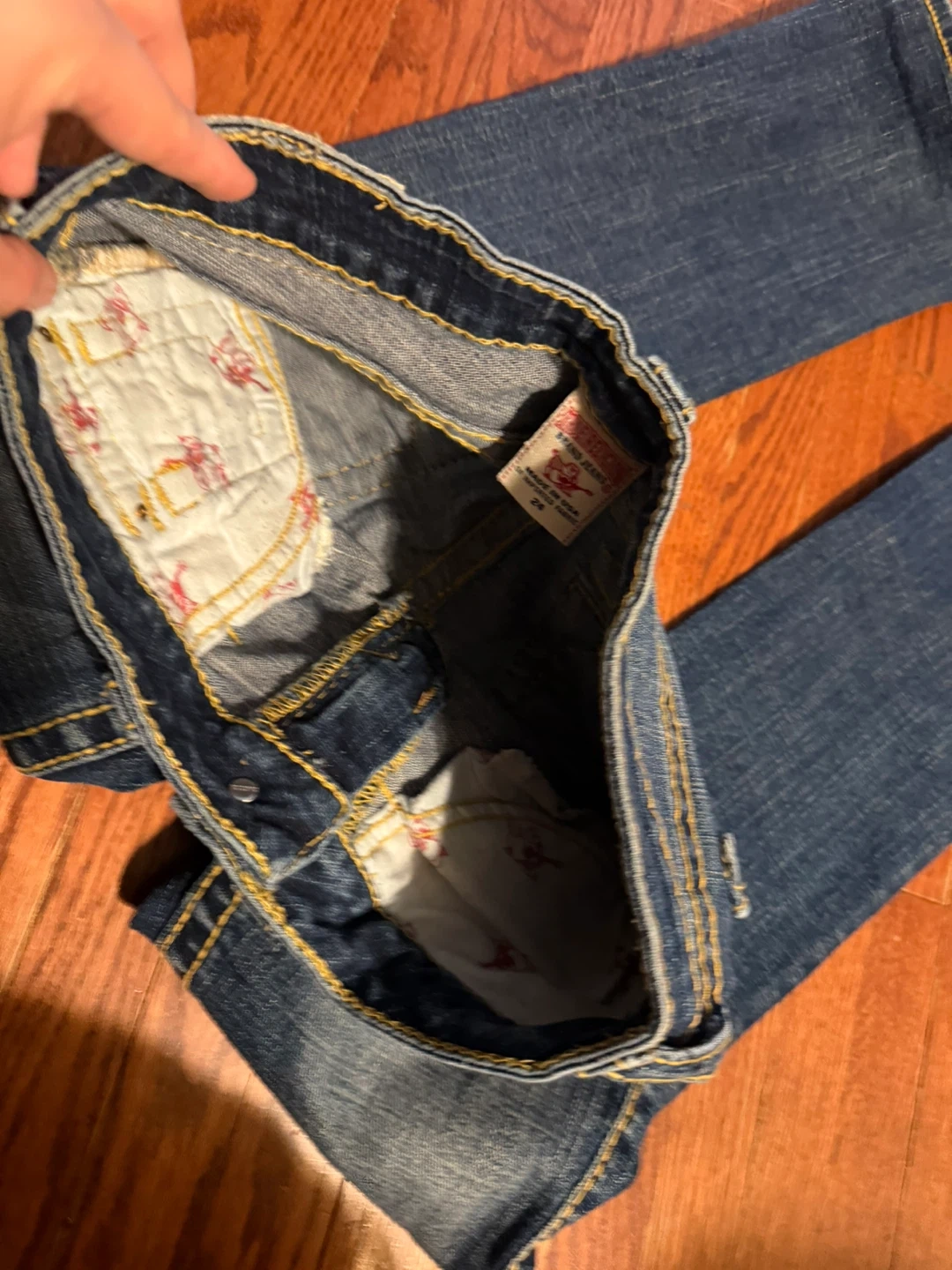 These are True Religion women's bootcut jeans. They're a dark blue wash with yellow contrast stitching. Features the signature horseshoe logo on the back pockets.