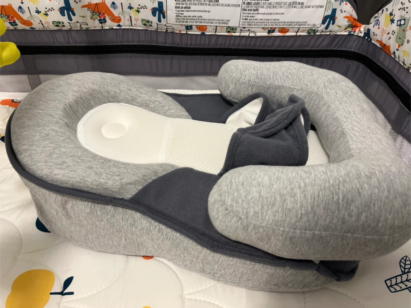 This baby sleep positioner has a soft, breathable cotton cover. It's designed to offer comfort and support for newborns. This provides a cozy space for infants to rest.