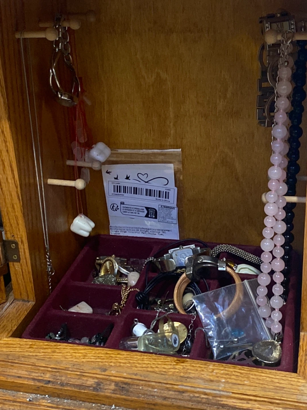 This oak mantel clock features a decorative face and opens to reveal a velvet-lined jewelry box. It's battery operated and includes a compartment for storage. An ornamental piece that's also functional!