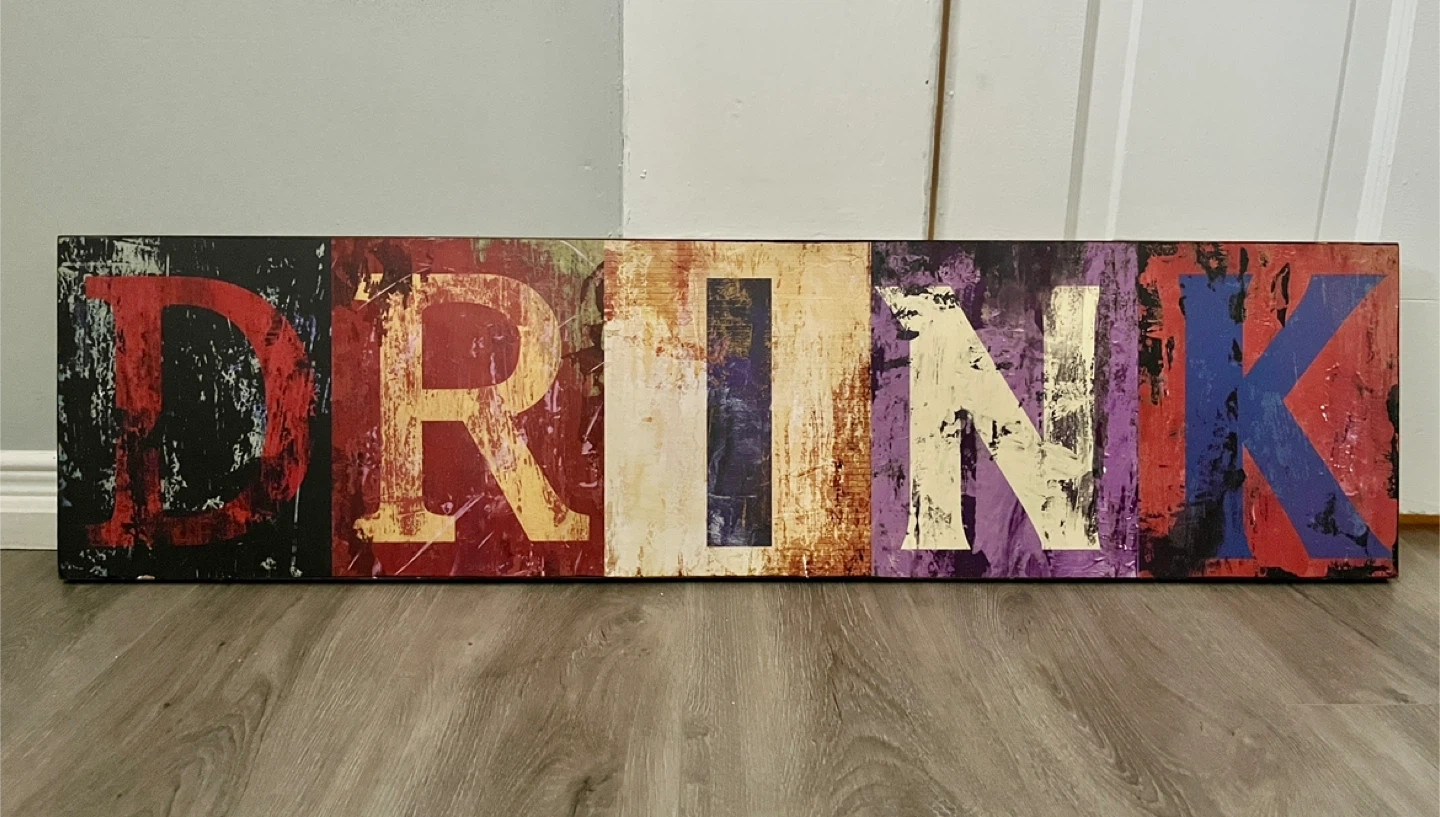 This is a cool, multi-panel wall art piece spelling out the word "DRINK". It features a distressed, abstract design with vibrant colours and textures. Perfect for a kitchen, bar area, or dining room!