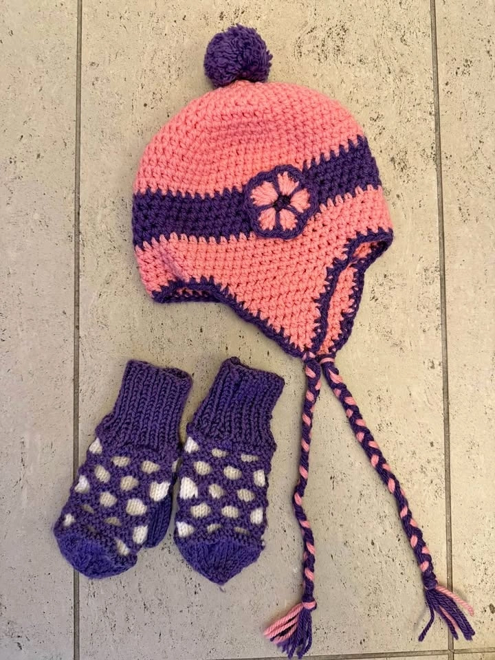 Girls handknit hat and mitts Size 3-5