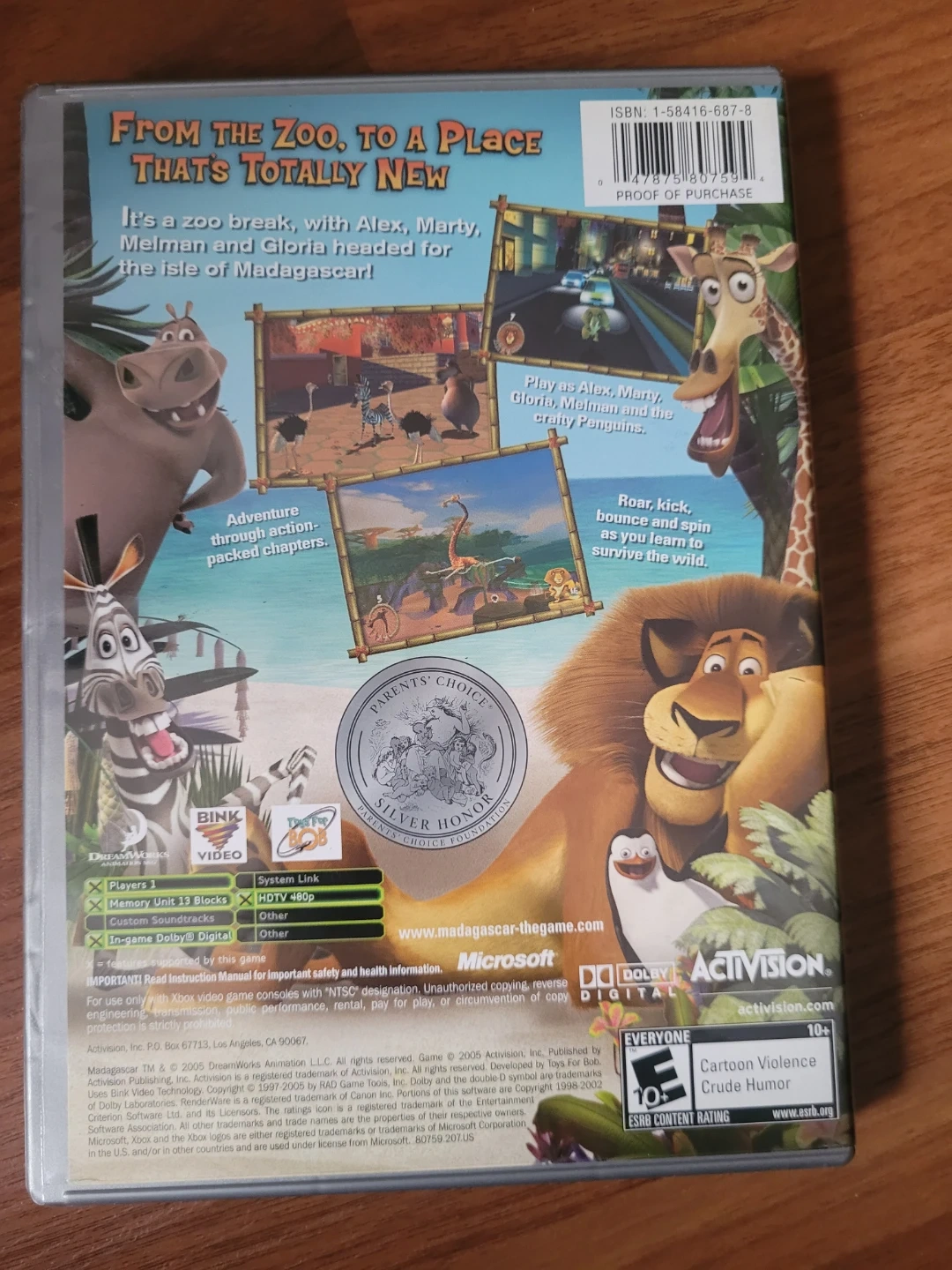 Classic Xbox game Madagascar Platinum Family Hits. Has Alex, Marty, Melman, and Gloria on a wild adventure to Madagascar. Play as your favorite characters and penguins. Adventure through action-packed chapters. Game is 1 player, uses 13 blocks memory unit, and has in-game Dolby Digital. ESRB rating Everyone 10+, cartoon violence, crude humor.