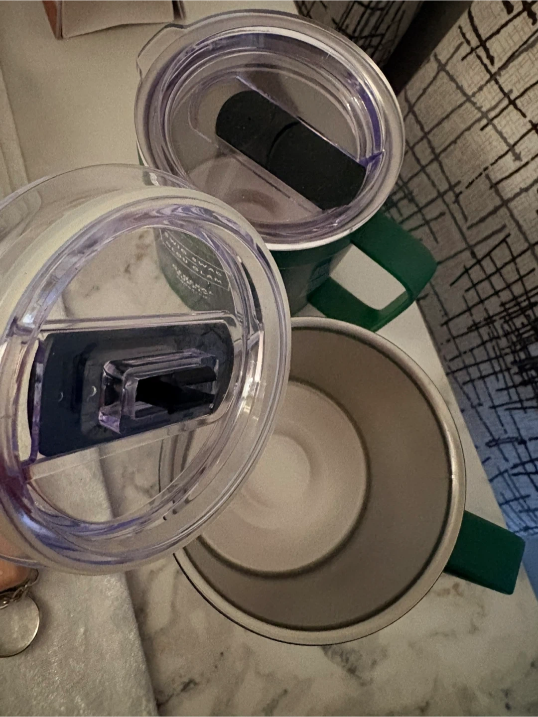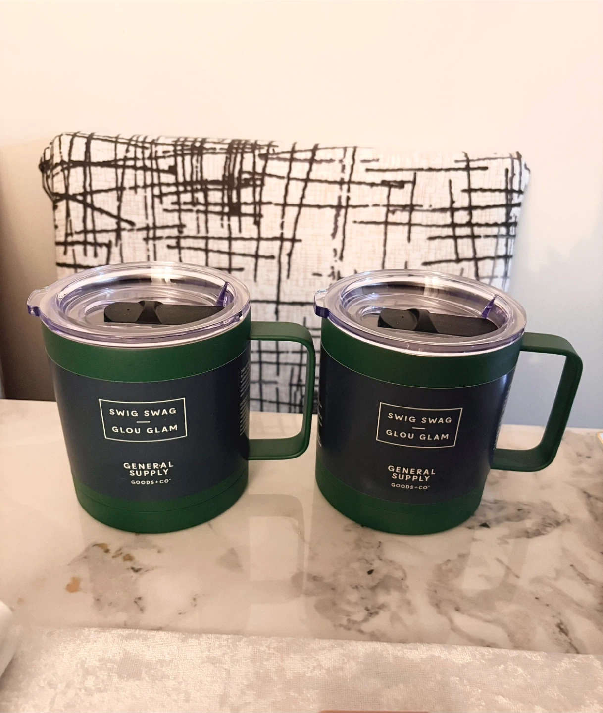 Two dark green tumblers with lids from General Supply Co. Made of stainless steel with double-wall construction. Each holds 400 ml or 13.5 fl oz. They're perfect for keeping your drinks hot or cold!
