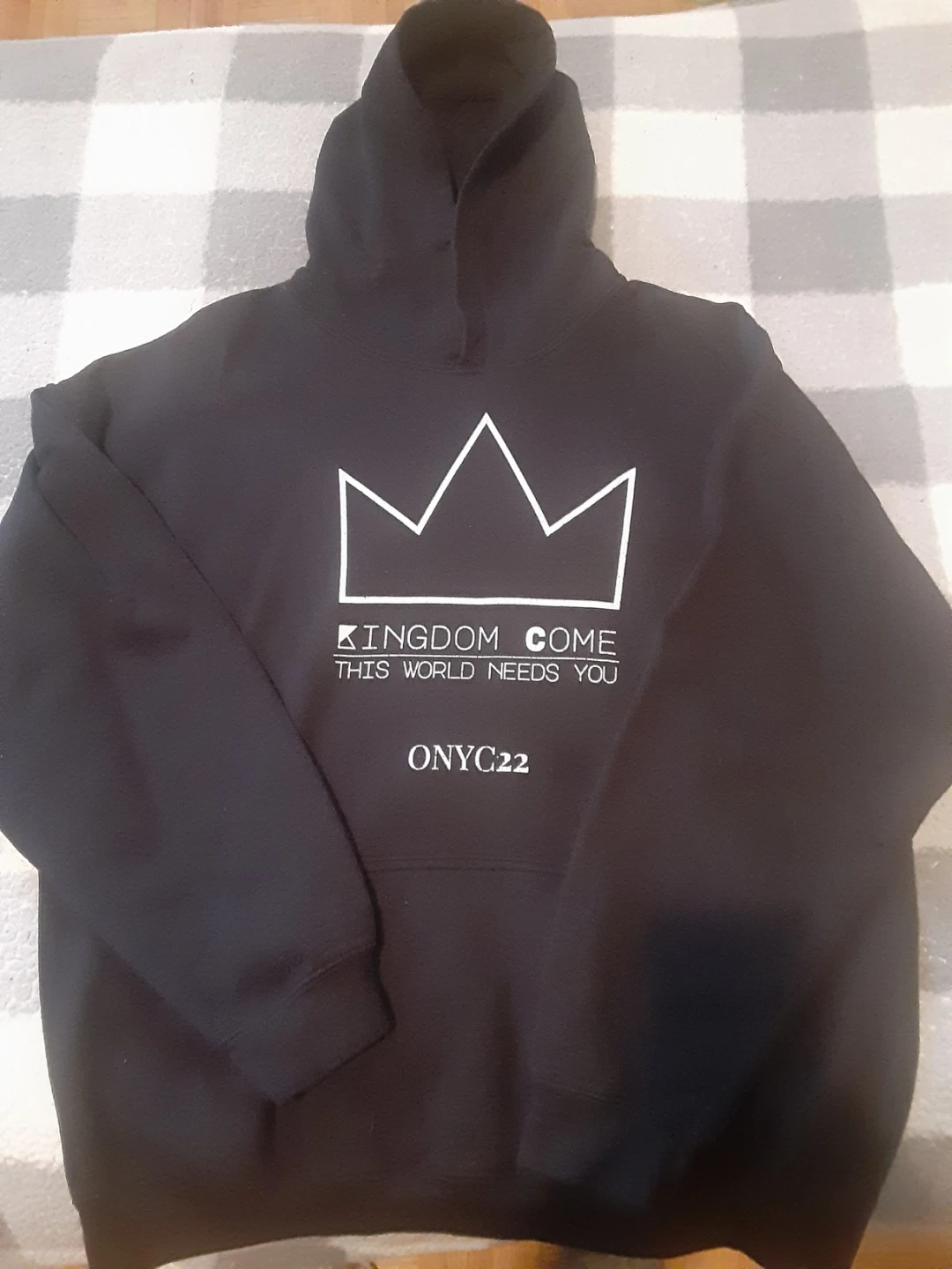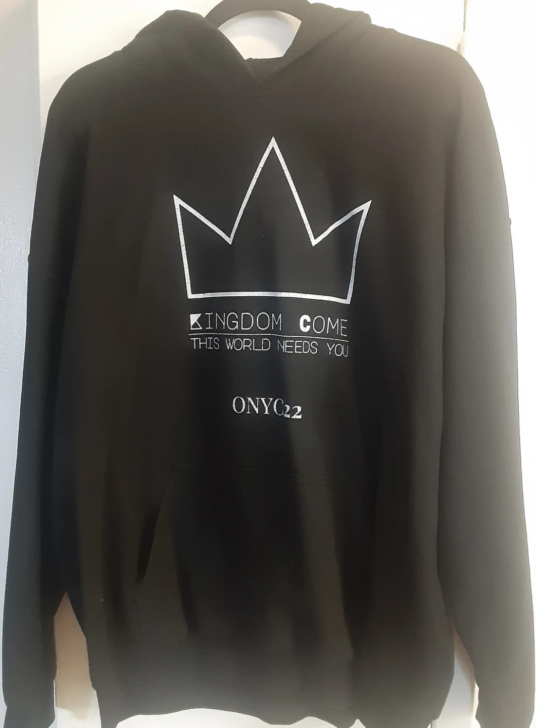 A black Gildan hoodie with "Kingdom Come This World Needs You" and "ONYC22" printed on the front. It's a comfortable hooded sweatshirt.