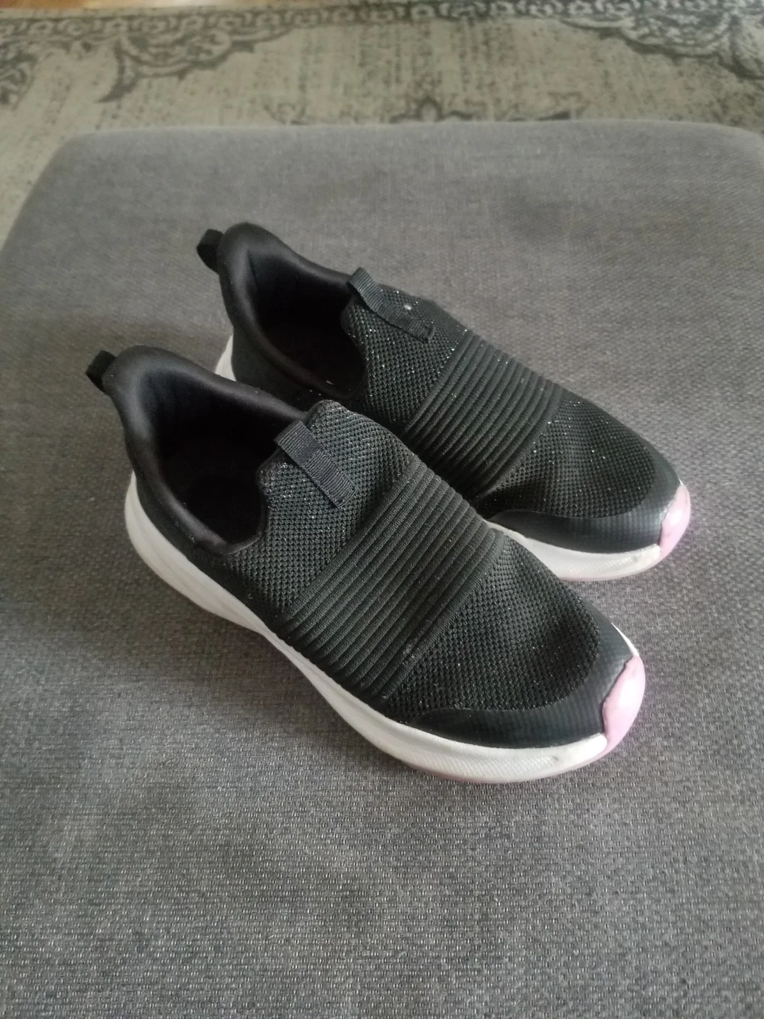 Hey Fellow Karroters 🧡 These black slip-on sneakers feature a comfortable mesh upper and a durable rubber sole with pink accents. They're designed for easy wear. The size marked on the sole is 4. Just want Gone Don't Need Asking $5
