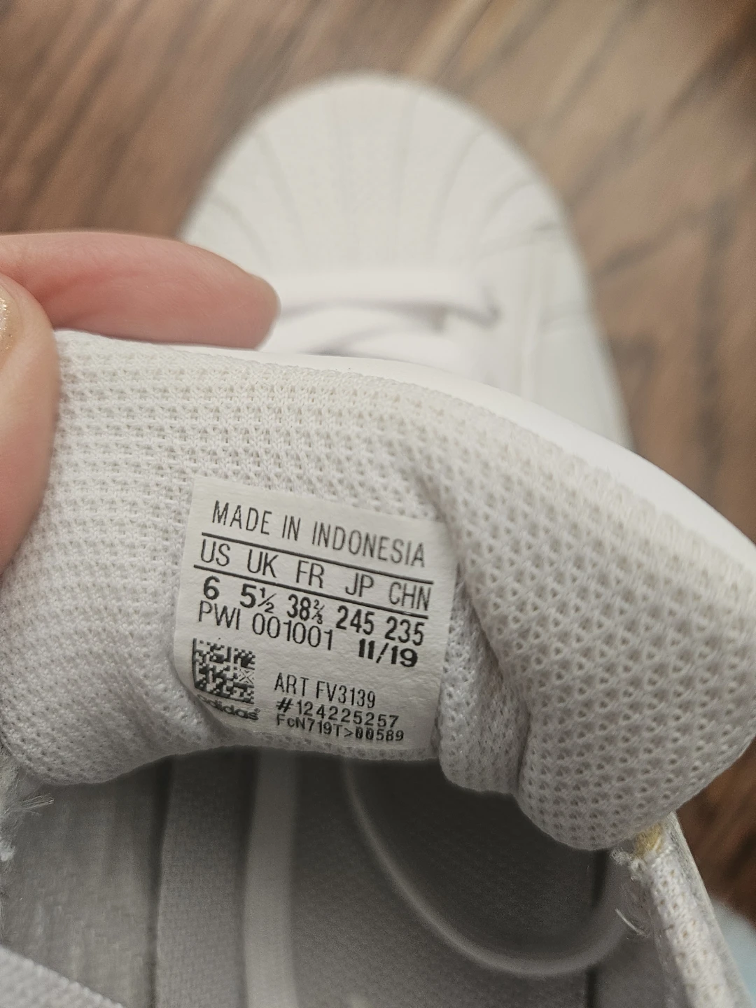 White Adidas Superstar sneakers with iridescent stripes and heel tab. Made in Indonesia. Manufactured November 2019.