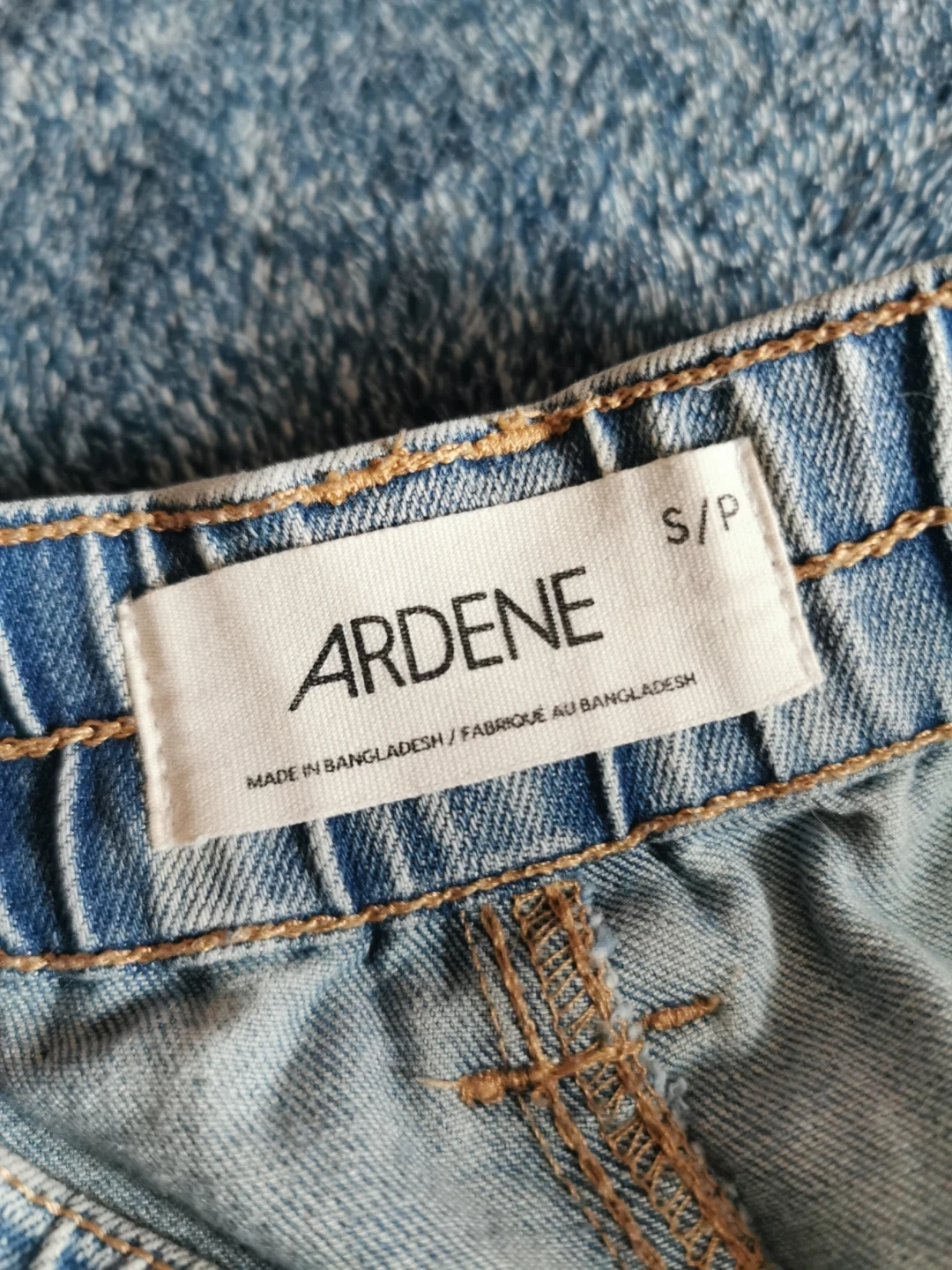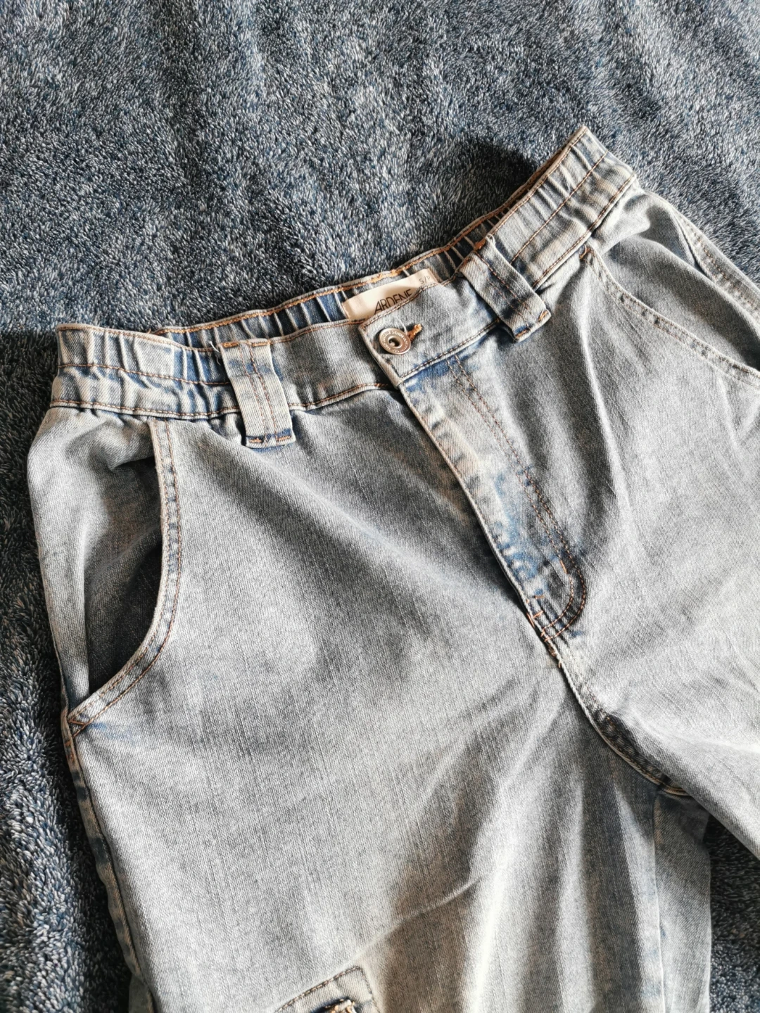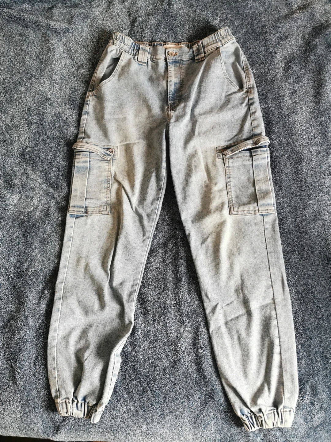These are light wash denim cargo pants from Ardene. They're a size S/P and feature an elastic waistband with a button closure. Made in Bangladesh.