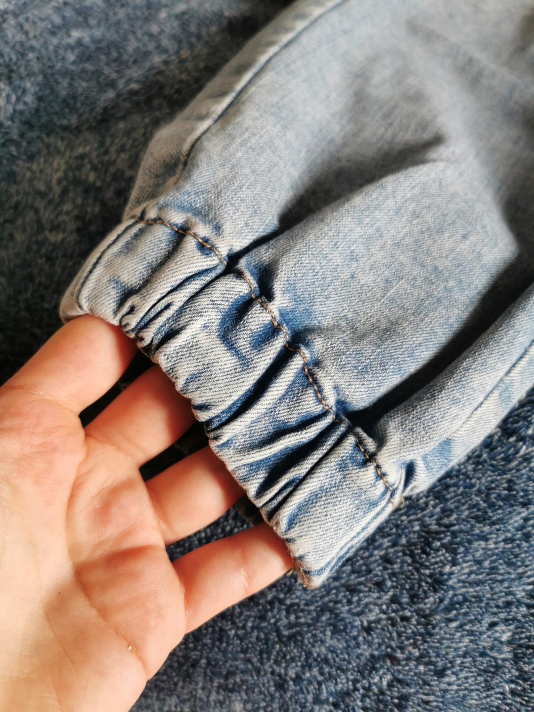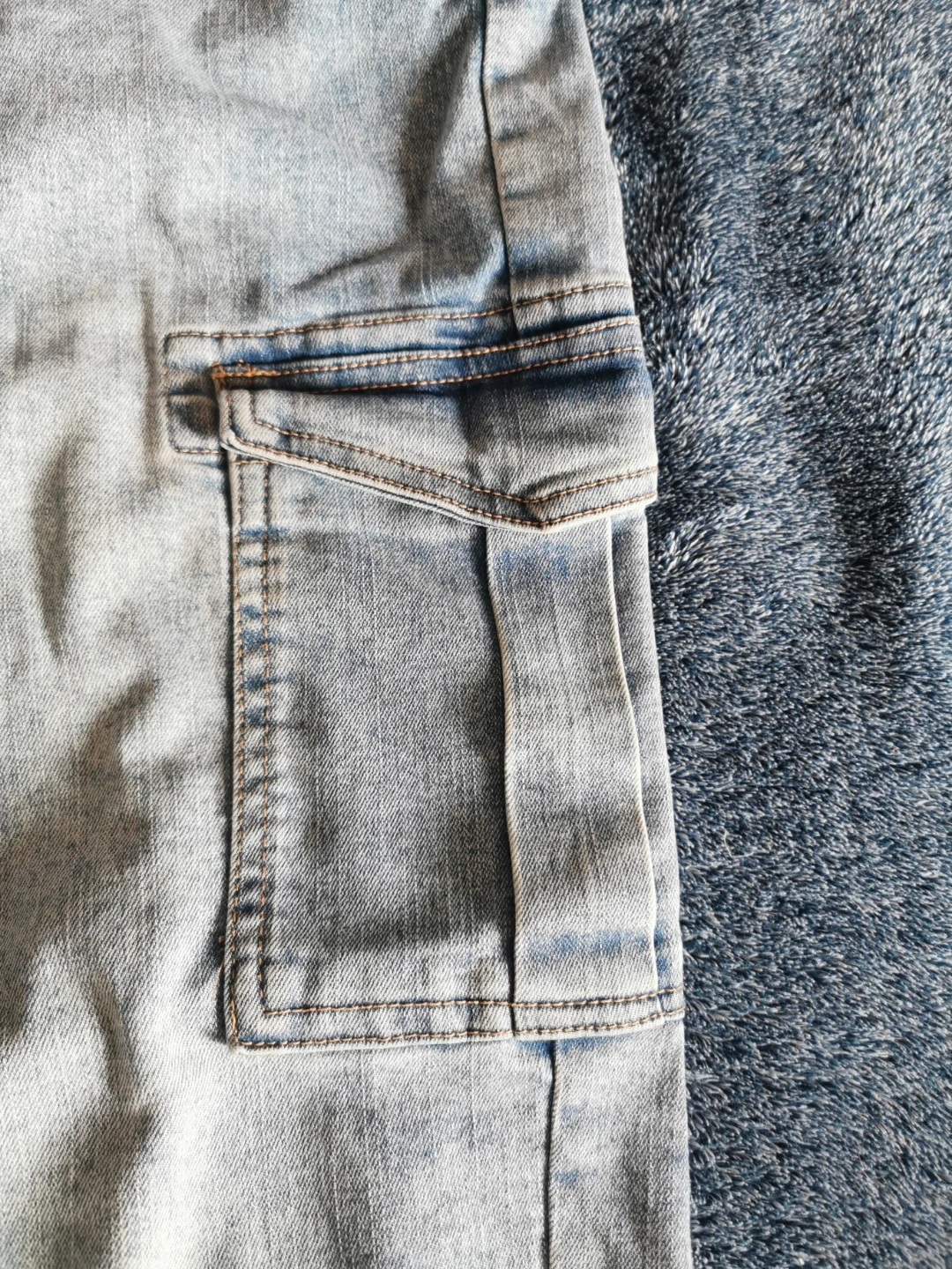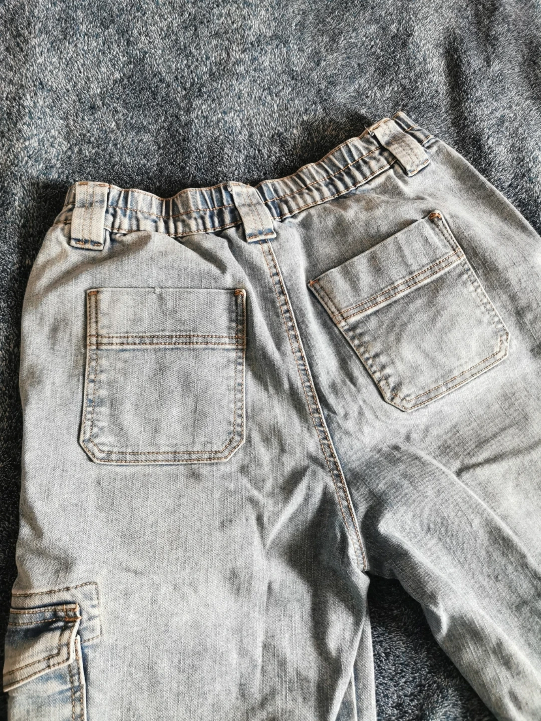 These are light wash denim cargo pants from Ardene. They're a size S/P and feature an elastic waistband with a button closure. Made in Bangladesh.