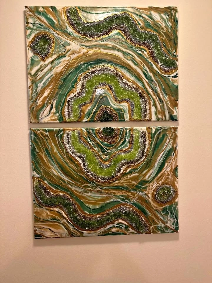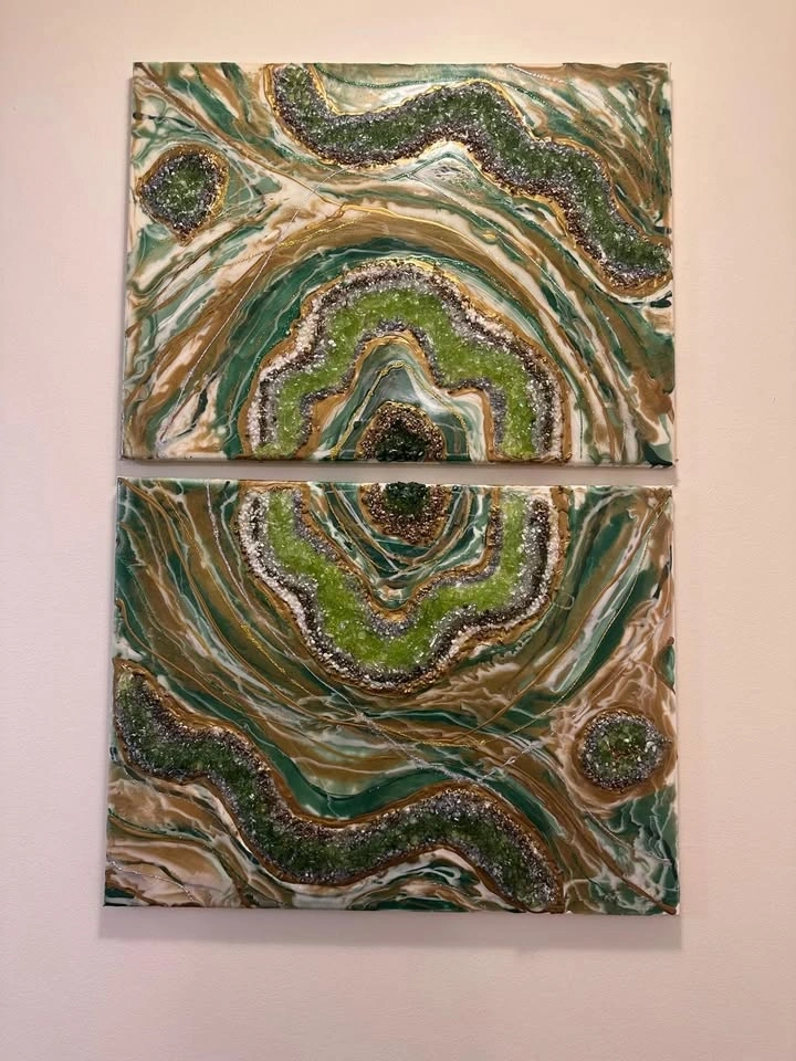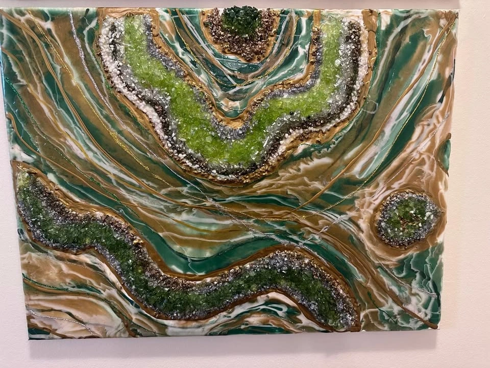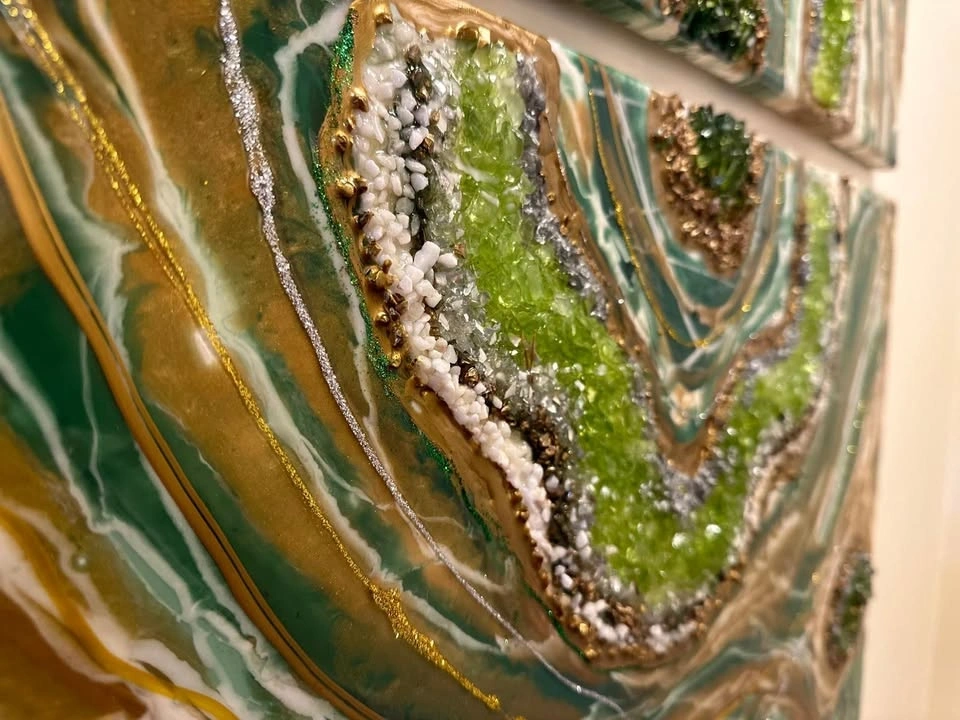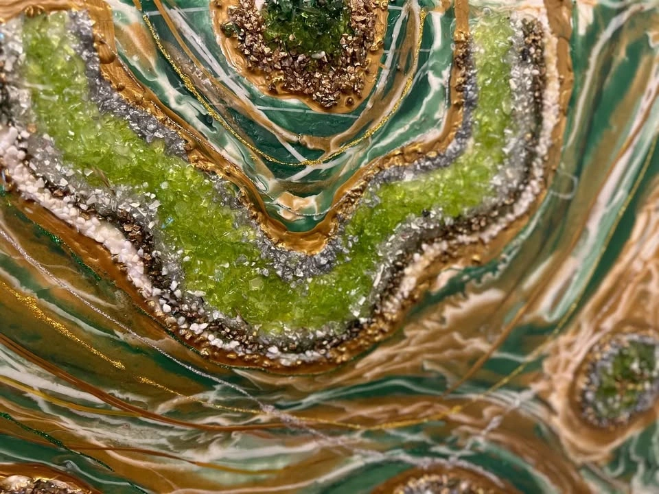 Bold, luxury wall art inspired by natural emerald geodes. Handmade with rich green tones, gold accents, and textured crystal details that reflect light beautifully. Perfect for living rooms or entryways. Prices vary by size. Message for details or custom orders.