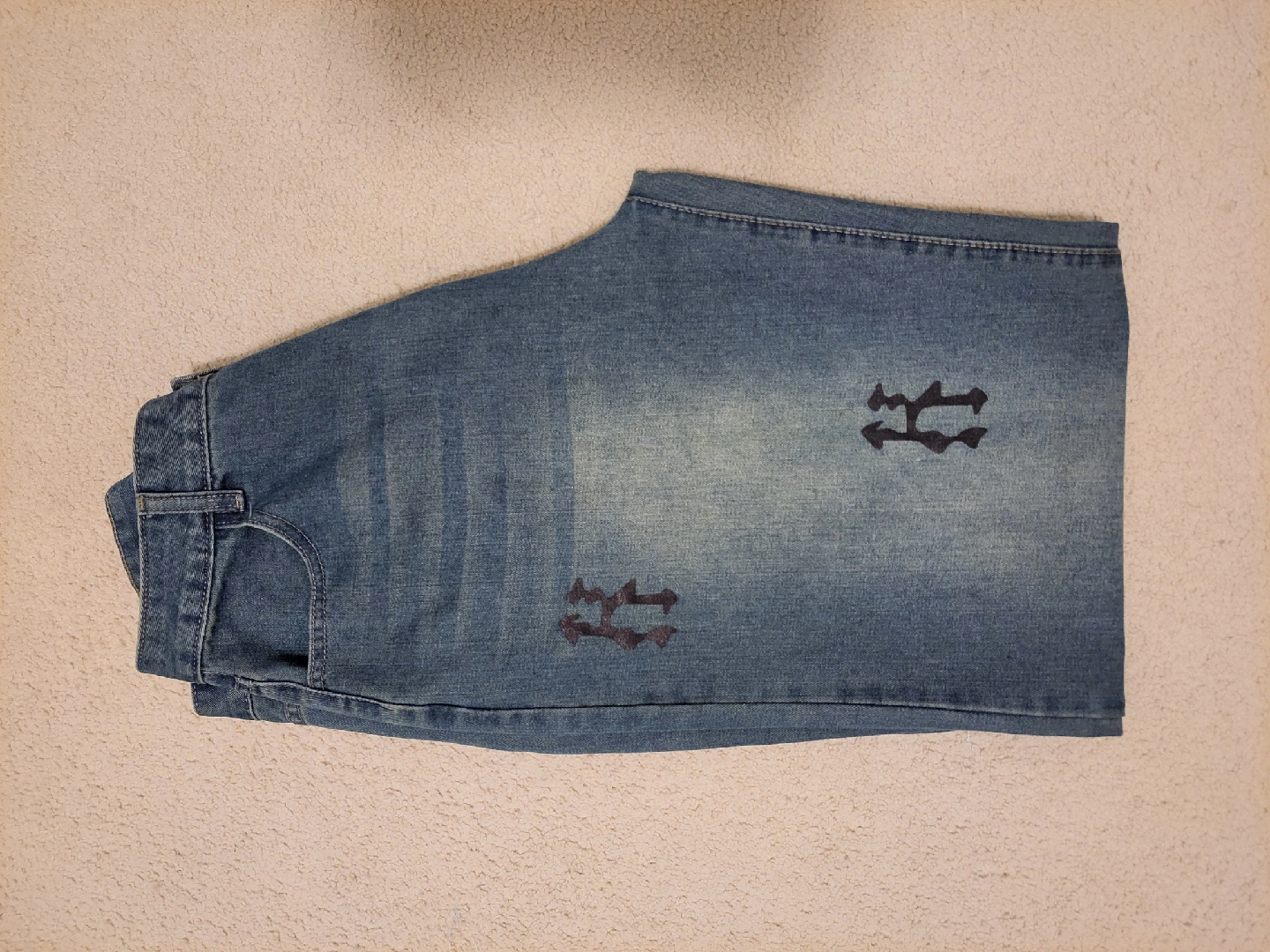15Selling a pair of blue denim jeans in size XXL. They're made of 85% cotton and 15% polyester and have a unique design!