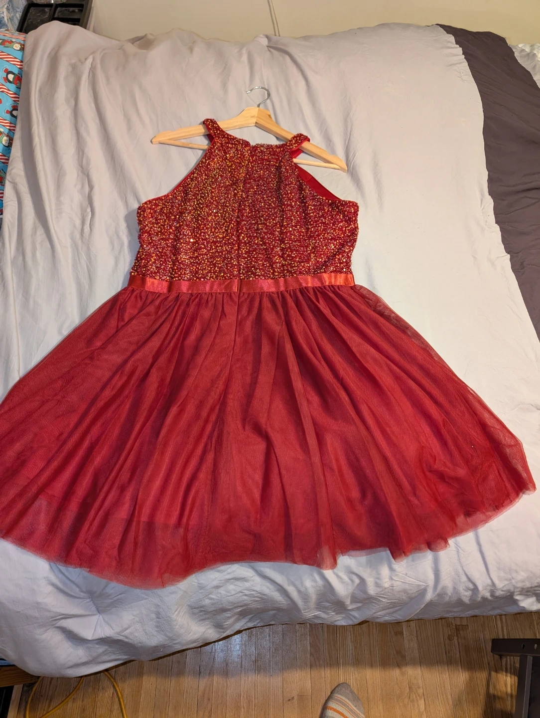 Sparkly red halter neck dress with a sequined bodice and a full tulle skirt. It's perfect for parties or special occasions. The dress has a comfortable fit with a defined waist.