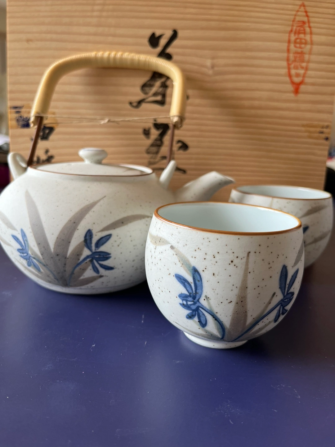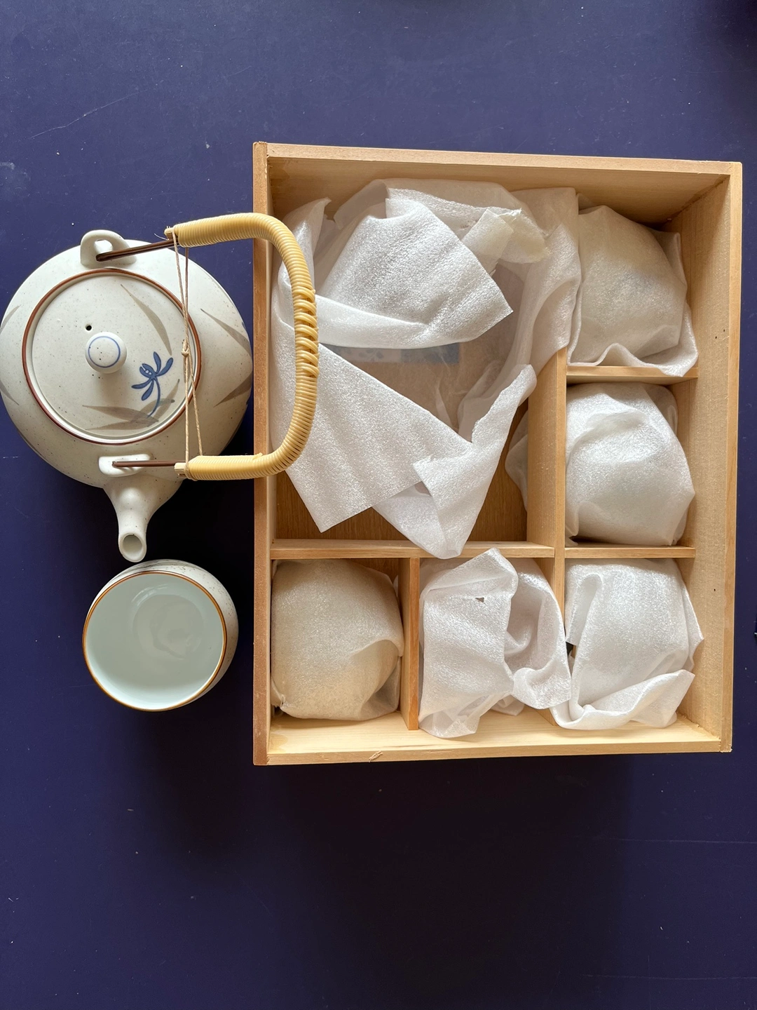 Brand new beautiful Japanese tea set with a teapot and five cups, in original wooden box. If ad is up, the item is available.
