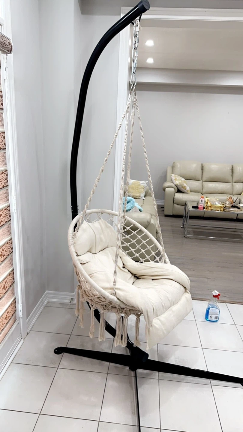 This hanging swing chair features a comfortable, tufted cushion and a sturdy black metal stand. It's made with a woven macrame style basket and braided rope hangers. Perfect for a cozy reading nook or relaxing spot!