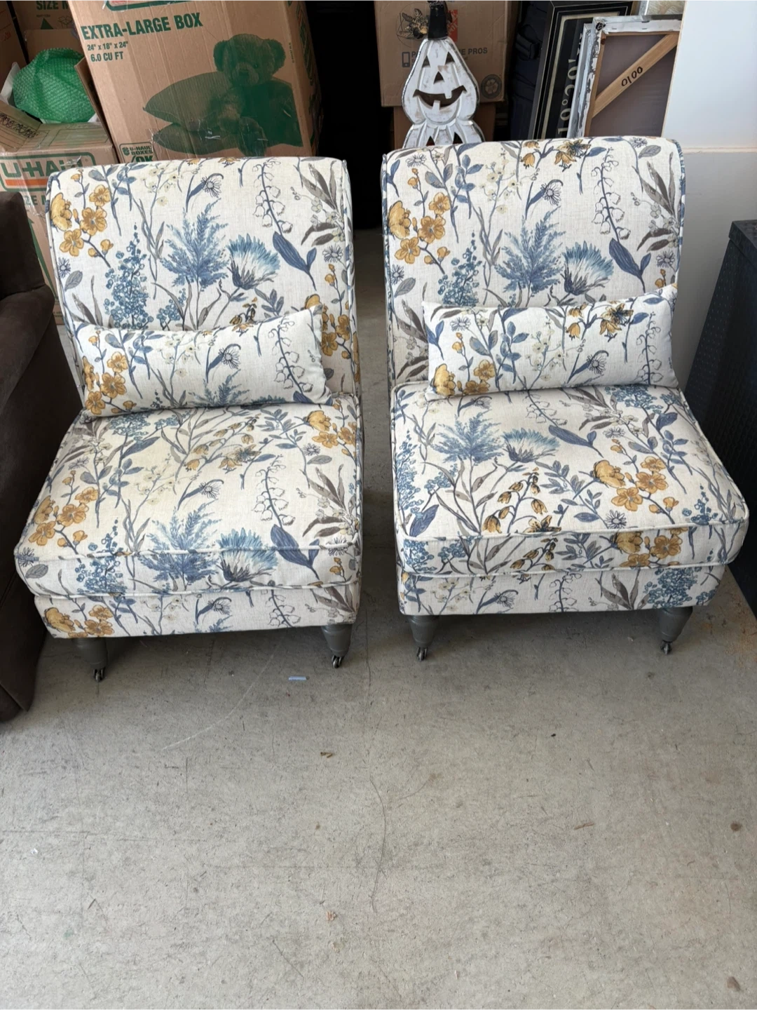 Selling a pair of accent chairs with a lovely blue and yellow floral pattern. Each chair comes with a small decorative pillow. They're upholstered in fabric and have wooden legs with small casters. These chairs would look great in a living room or bedroom!