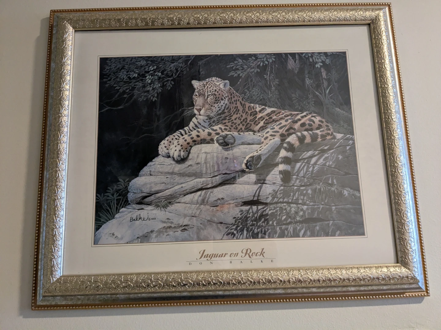 Art print titled "Jaguar on Rock" by Don Balke, dated 1992. Features a jaguar resting on a rock in a jungle setting. Comes in a decorative silver and gold tone frame.