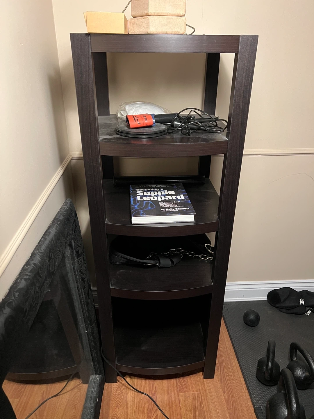 This dark brown corner bookshelf offers five tiers of storage. It's made from wood composite material. Great for organizing books or display items!