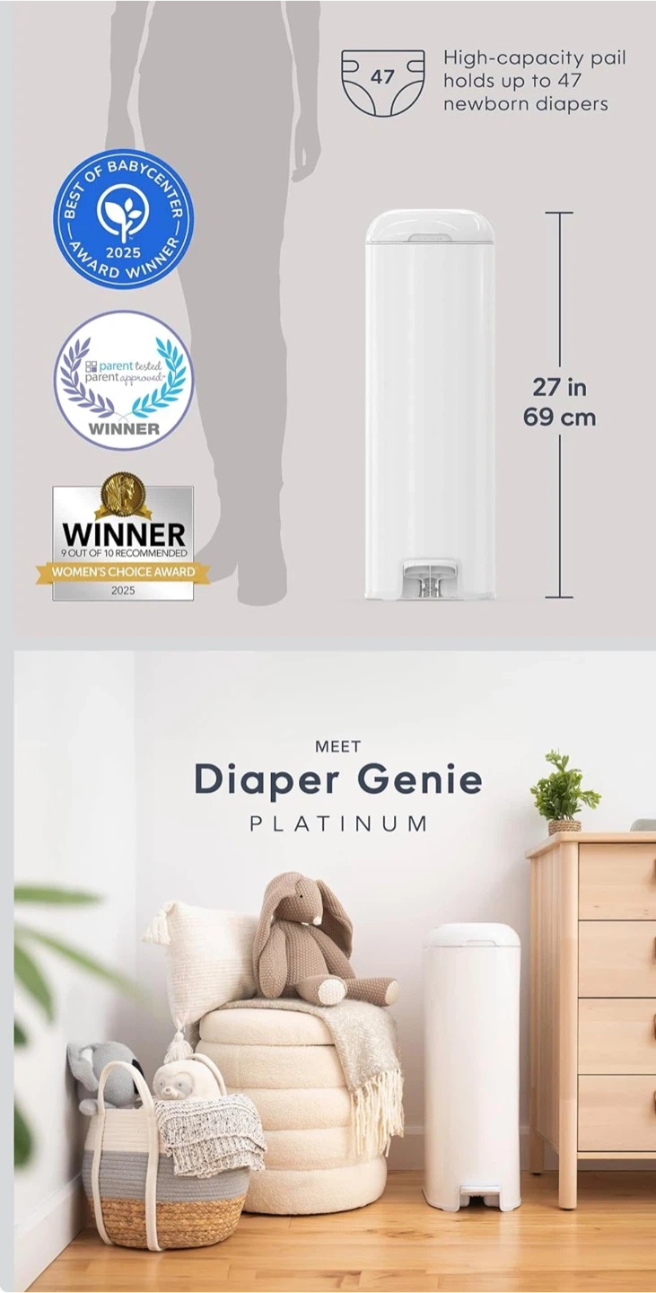 This Diaper Genie Platinum offers a stainless steel design for odour-locking clamps and hands-free operation with a foot pedal. It's a high-capacity pail that holds up to 47 newborn diapers. This pail is useful for keeping nurseries fresh and tidy.