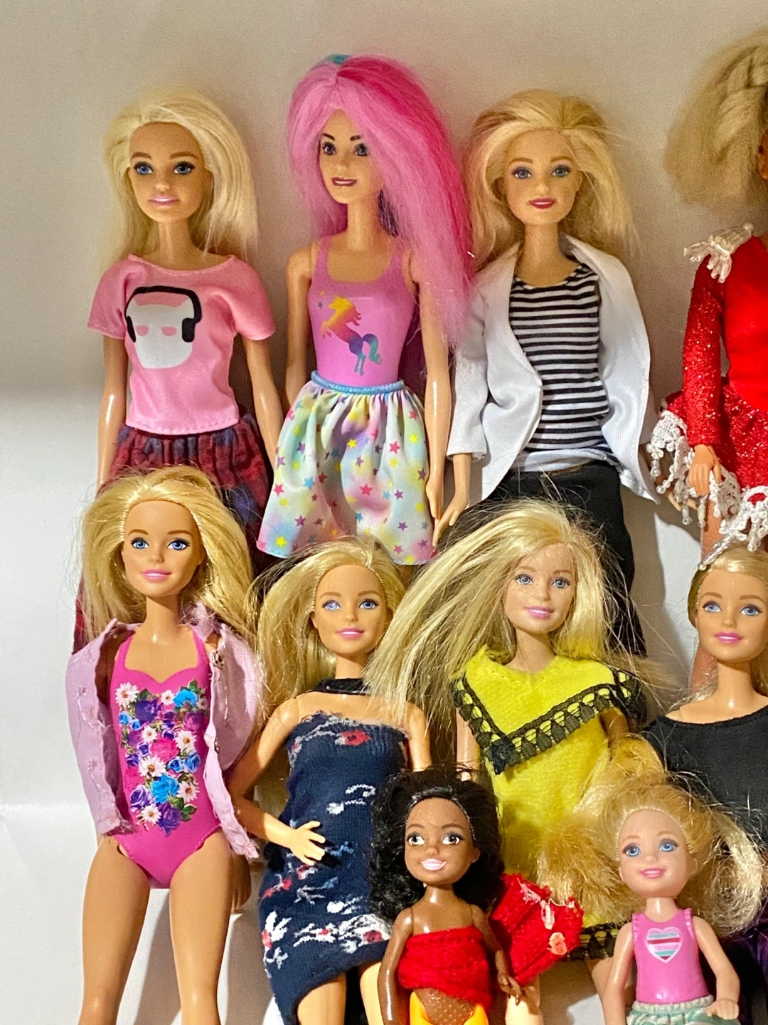 This lot includes a collection of assorted Barbie dolls and smaller fashion dolls with some flaws from play. They're dressed in various outfits and accessories. These dolls are great for imaginative play!