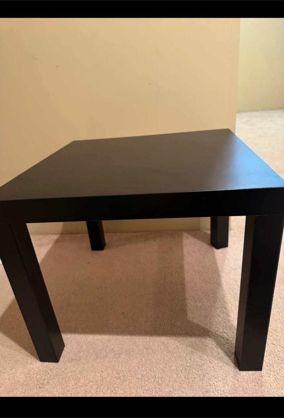 A simple black square side table. It's made of a dark material with four sturdy legs. This table is a handy size for placing next to a couch or chair. From ikea