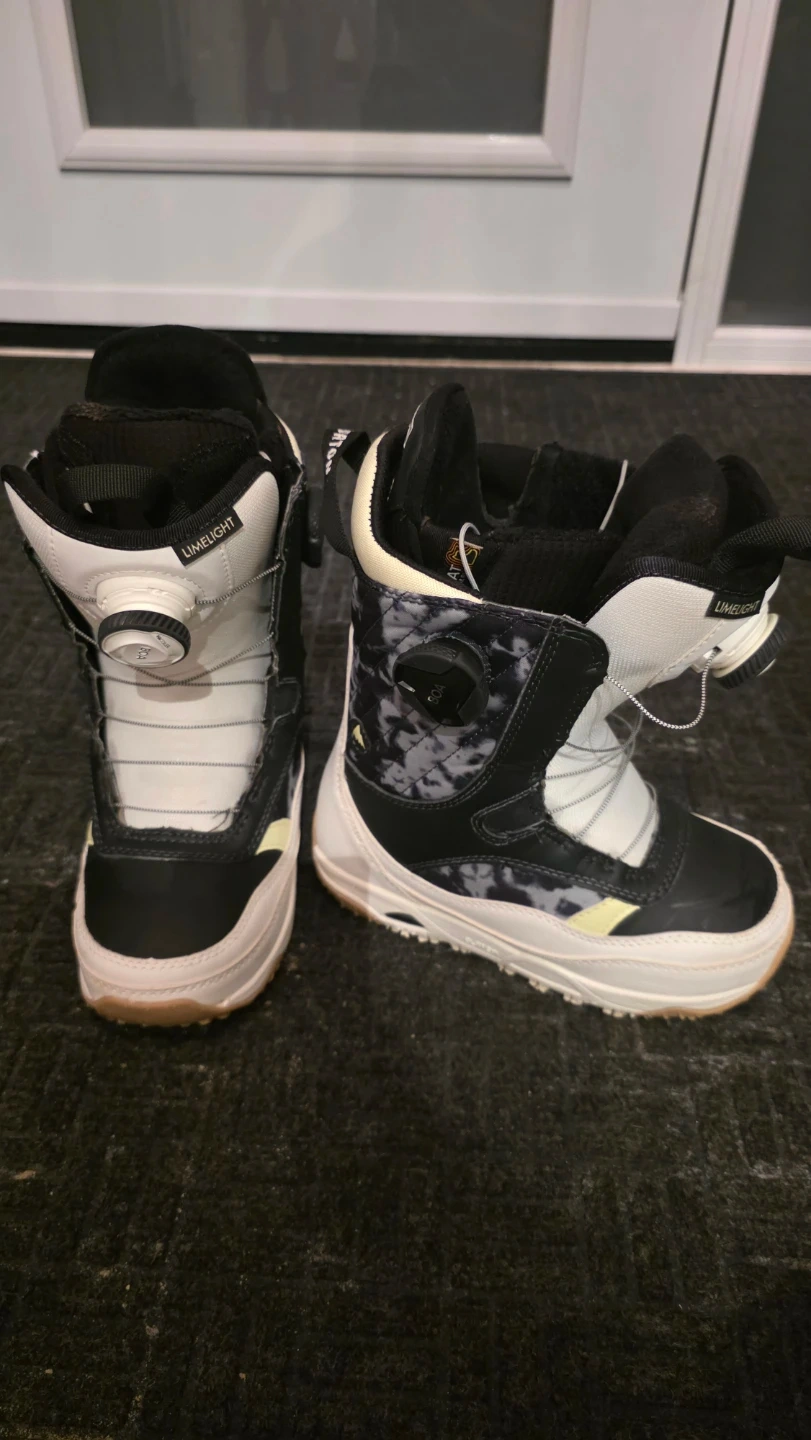 Women's size 4 (216cm) Burton Limelight snowboard boots with Double Boa lacing system. Imprint 2 liner. Features a black, white, and grey tie-dye design. These boots are perfect for hitting the slopes!v Lightly used 1 season only