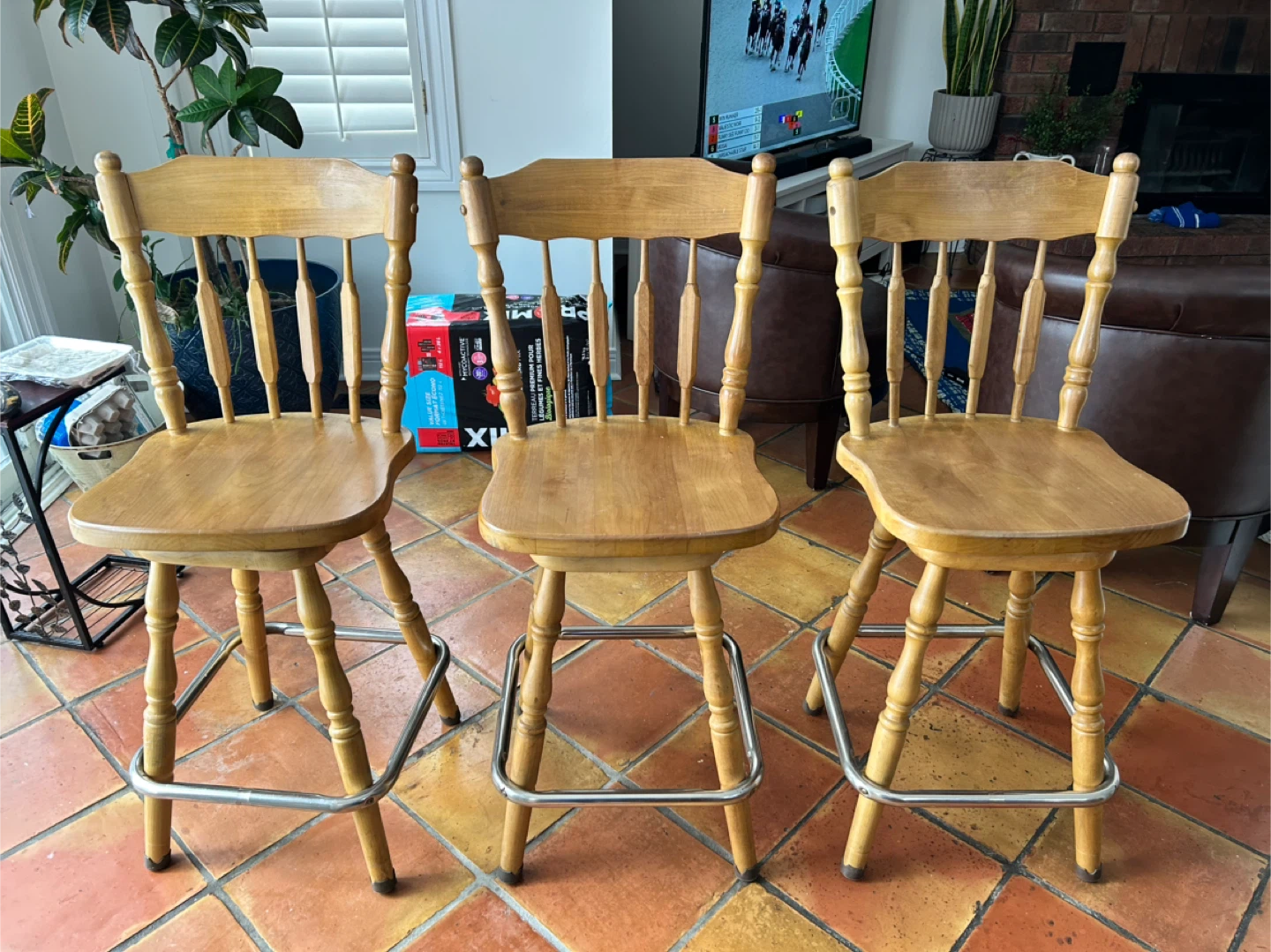 Three classic wooden bar stools with a natural wood finish. They feature a spindle back design and a built-in footrest. These stools counter height.