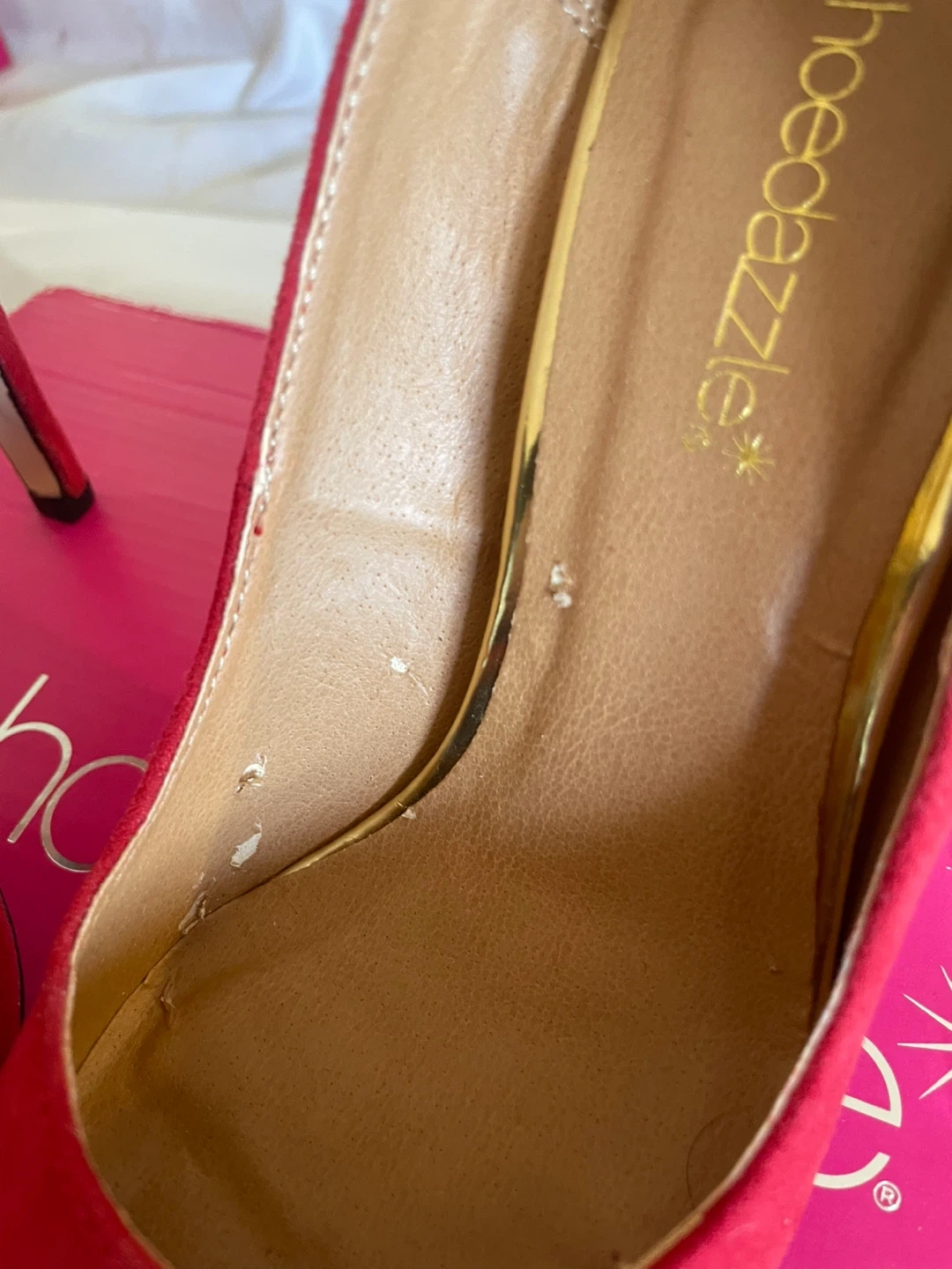 They have never been worn but they do have a few spots inside the shoe peeling. They have been sitting in the box too long without any use. Comes with a bag. Also comes with some extra pieces for the bottom of the heels.